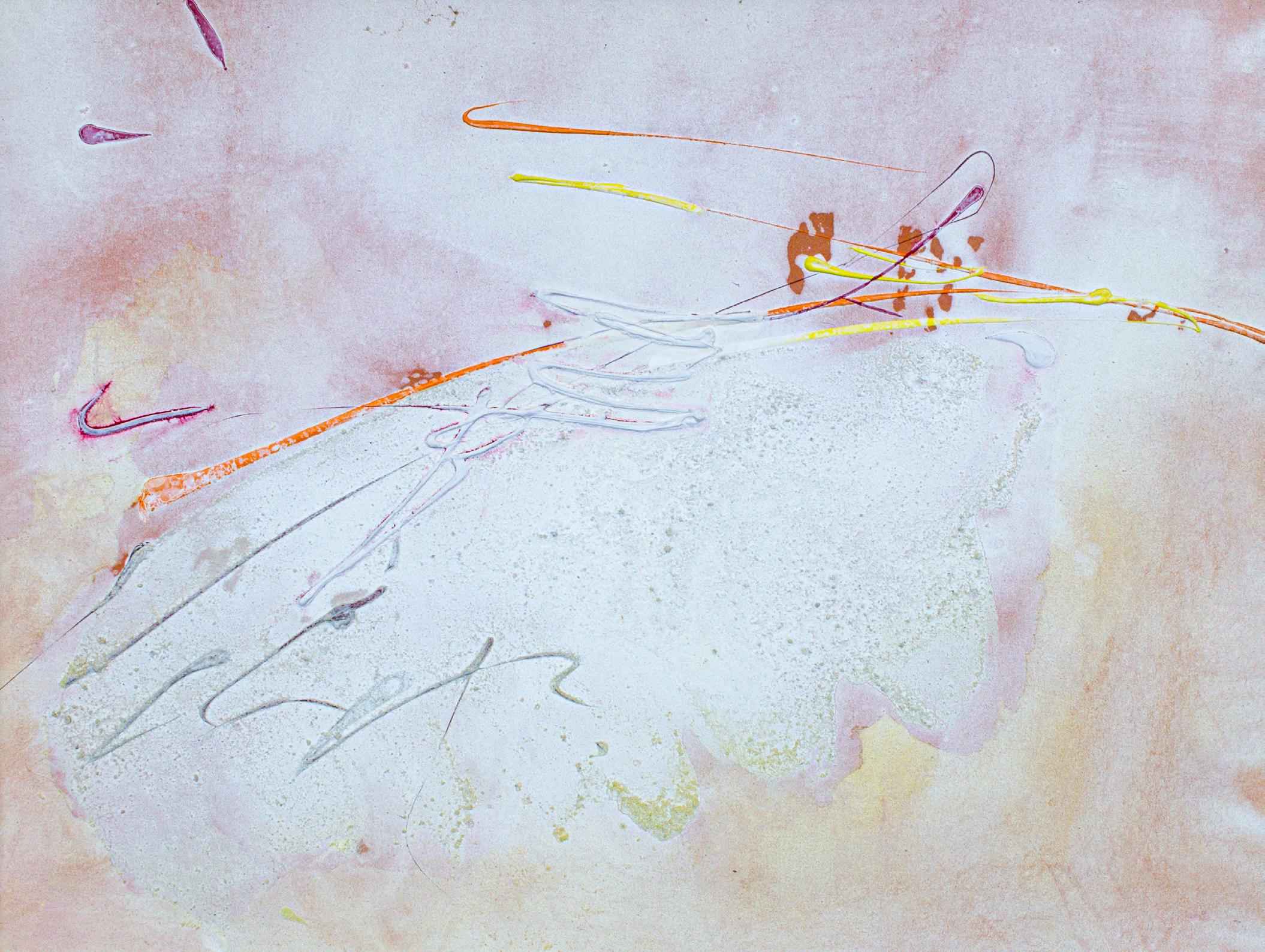 In 1979, after a period when she had created many works in subdued umbers and grays with varying surface qualities, she reintroduced a richer, brighter palette in paintings such as Bay Queen I, Dry Gulch, and Befit. She continued to “draw” with squeegees and to include central motifs, sometimes allowing the sculptural properties of the insulation cement to form shapes. In 1979, when a strange creature with the bio-morphic qualities of a Max Ernst painting emerged in a painting, Francis titled it Alien. Increasing the freedom of her movements, she produced more diffuse, active surfaces. In 1981, she produced a series of much quieter images in the light-toned blended palette she had used earlier. For these works, she used pouring rather than squeegees, letting the paint flow slowly so that shapes emerged, which she then at times touched up with light brush handling. Among these are Pete’s Neck. These works were inspired by the light, water, land, and air of Long Island, and Francis refers to them as “island paintings,” also acknowledging their map-like aspects. Indeed, the shapes suggest areas of dry land emerging from the depths, with shallow water lapping their shorelines against stretches of open glistening water. Their perspectives seem to be aerial or sweeping diagonals. A group of these works was exhibited in a four-artist exhibition at Watson / de Nagy & Company, Houston, in February–March 1981.
