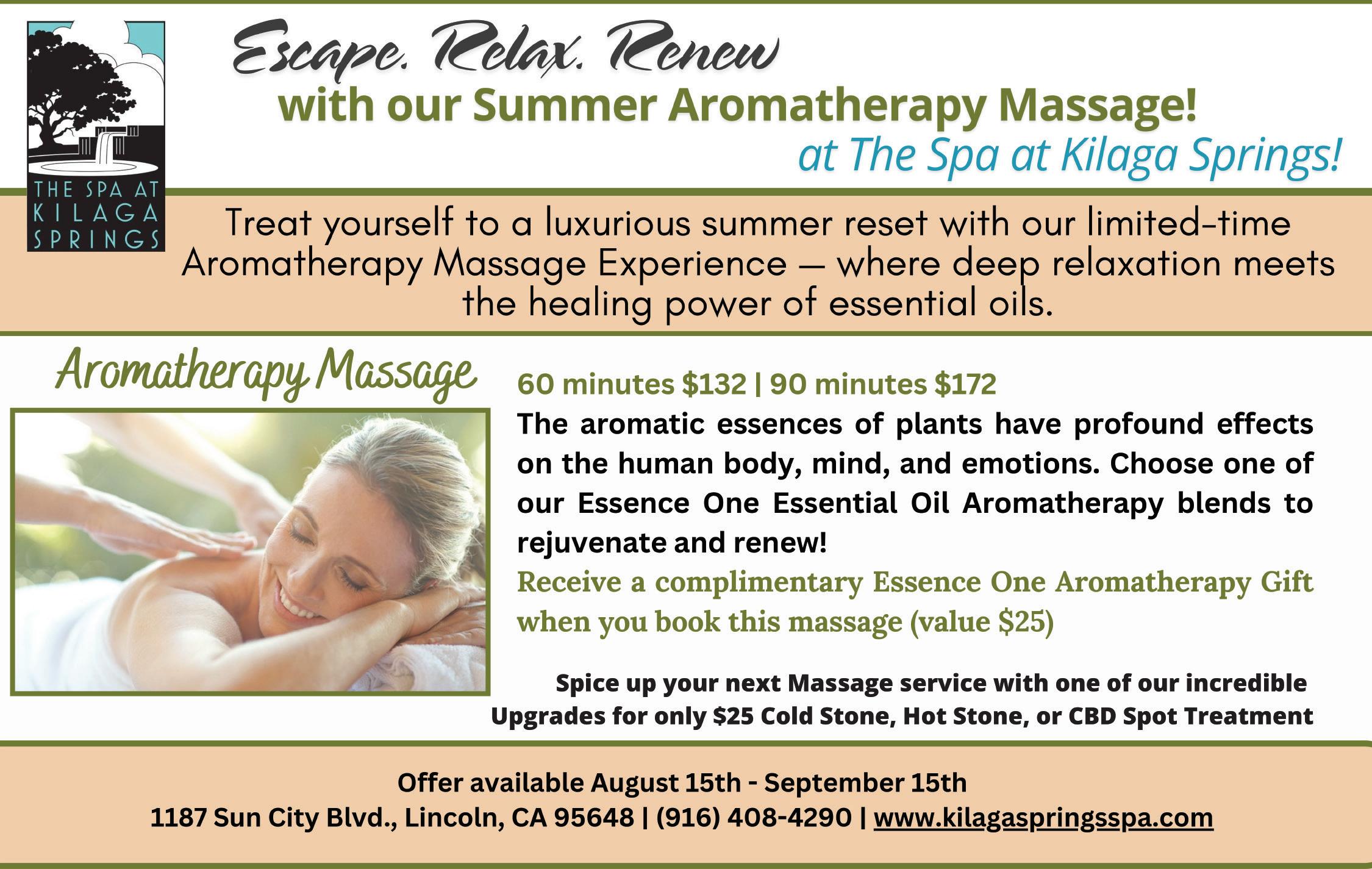 Enjoy our Aromatherapy Massage, 60 minutes for $132 and 90 minutes for $172. To sweeten your spa escape, you will receive a free Essence One Aromatherapy gift when you book this treatment.