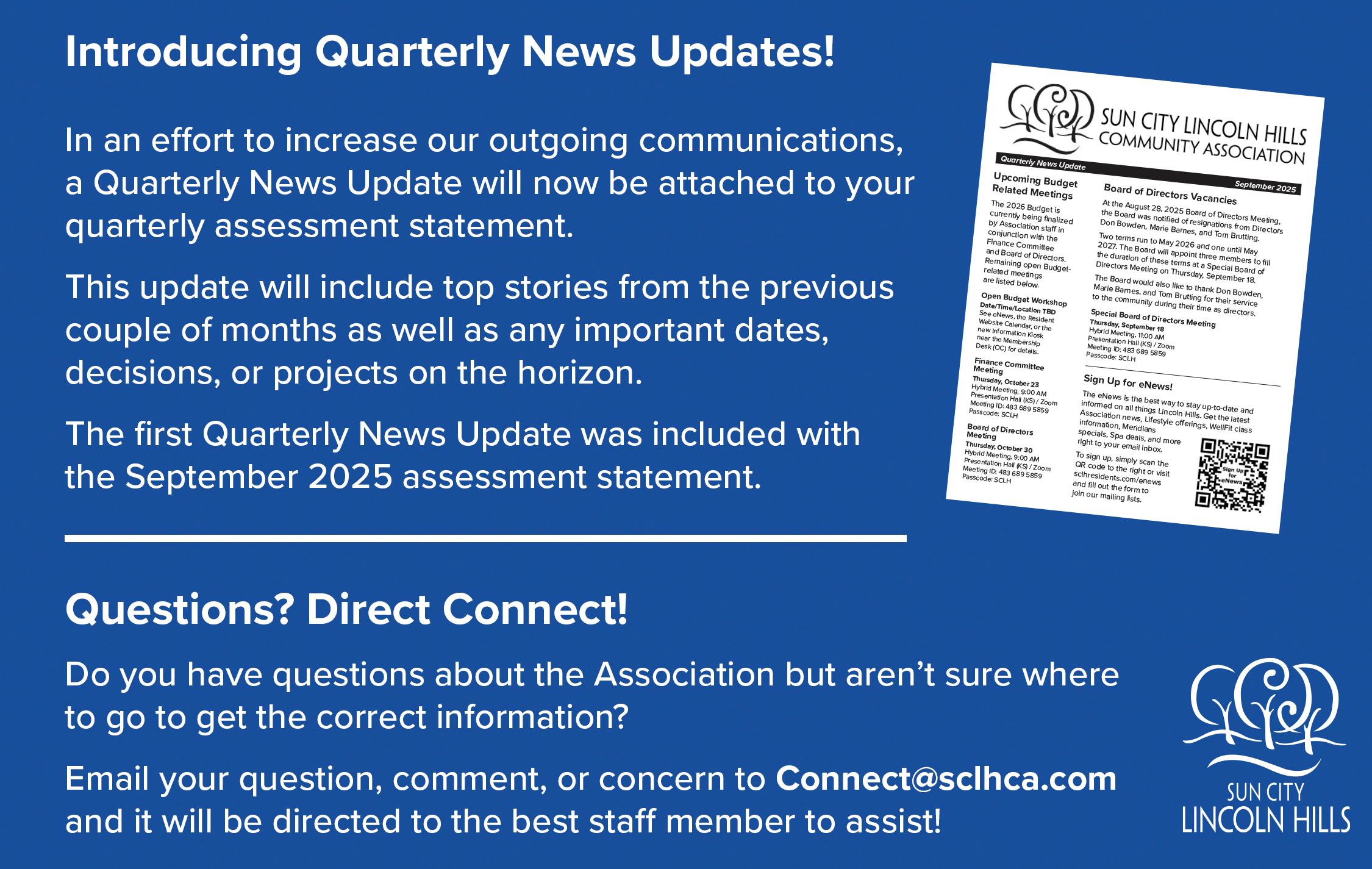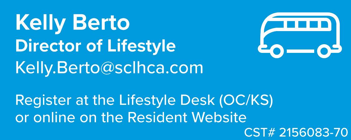 Soon the weather will lend itself to hot chocolate, a blanket, and a good read. What could be better? October’s selection is Lady Tan’s Circle of Women by Lisa See. November’s selection is The Secret Gate by Mitchell Zuckoff. Come join the discussion. We meet in the Multipurpose Room (OC) from 1:00 to 2:00 PM on the third Thursday of the month. At the club meeting, you may sign up to receive the club’s monthly reminder and essential notifications. Contact: Joanne Felt, ocbookgroup@gmail.com Website: https://sclhresidents.com/ group/pages/book-group