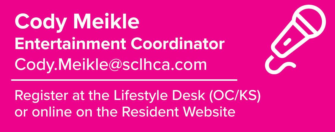5/15 New Resident Orientation ............................ 45 5/18 Parking Lot Sale 45 5/18 Stunt Dog Experience .................................. 58 5/20 How Foods Fight Cancer 78 5/21 Town Hall ..................................................... 45 5/21 Road Trip - Community Forum ..................... 45 5/21 Movement 77 5/22 Bingo ............................................................ 23 5/22 Dance Night Structured 55 5/22 de Young Art Museum ................................. 58 5/24 James Garner – SACS 52 5/29 Steve Lucky 55 5/29 Restorative Reformer ................................... 80 5/29 Walk and Talk 81 5/31 Oppenheimer - Movie .................................. 47 5/31 25th Anniversary Launch Party 81 6/2 N.Y. Yankees vs S.F. Giants ..........................60 6/2 Live Ball ........................................................ 87 6/3 Needle Felting - Lavender Fields 71 6/4 Dance Night ................................................. 55 6/6 Hypnosis 79 6/6 Sound Bath Experience ............................... 80 6/6 Warm Up to Happy Hour 81 6/7 Carnaval – SACS .......................................... 52 6/11 Clogging - Step Workshop ........................... 65 6/11 42nd Street 59 6/14 Sip N Paint .................................................... 73 6/14 Digestive Health 77 6/17 Protein 101 .................................................... 78 Date Event Page # Subject to change. Please see eNews for updated times and dates. Annual Meeting of Members Thursday, May 16, 9:00 AM Finance Committee Thursday, May 23, 9:00 AM Board of Directors Thursday, May 30, 9:00 AM Board of Directors Executive Session Thursday, May 30, 11:30 AM CCOC/Clubs and Community Organizations Tuesday, June 4, 9:30 AM Committee Compliance Committee Wednesday, June 5, 9:00 AM Properties Committee Thursday, June 6, 9:00 AM Elections Committee Friday, June 7, 10:00 AM ARC/Architectural Review Committee Monday, June 10, 9:00 AM CCRC/Communications and Community Tuesday, June 11, 10:00 AM Relations Committee Board of Directors Workshop Thursday, June 13, 10:00 AM Board of Directors Executive Session Thursday, June 13, 1:00 PM Meetings subject to change. Visit sclhresidents.com for the most up to date information.