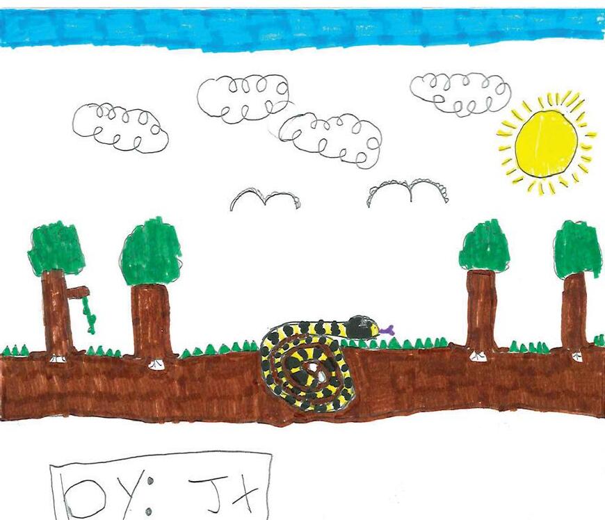 It’s kind of about fall, and they’re scared because there’s a big dog and a tree, and one guy left his money by it. There’s a spot he had his money in the backyard. The neighbor just moved in there, and they were making a spaceship. The kids didn’t know what they were making, so they wanted to get into the backyard to get the money, but they couldn’t because the dog was scaring them.