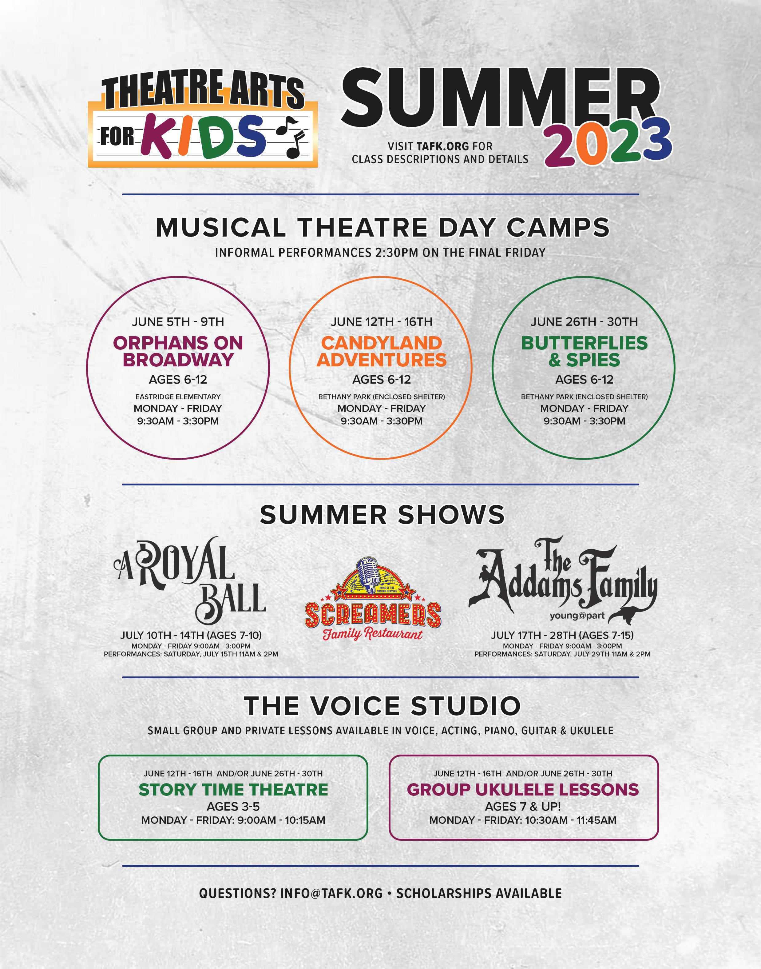 TAFK provides quality performance training for kids of all ages in the Lincoln community and surrounding areas. TAFK’s programming is inclusive and scholarship is always available. (402) 202-1087 info@tafk.org tafk.org