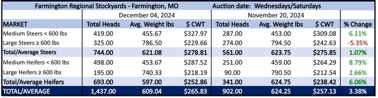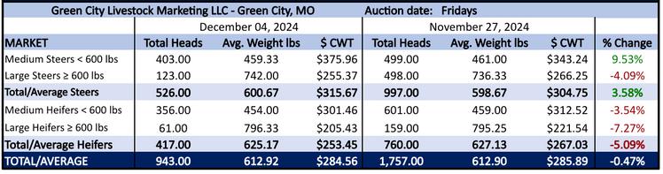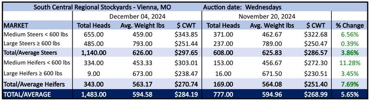 Market prices for livestock in Missouri are reported from the National Beef Wire database and USDA sources. Beef prices at live auctions report medium and large weight Classes. Steers and heifers with 599 pounds or less are medium-weight classes, and steers and heifers with 600 pounds or more are large-weight classes.