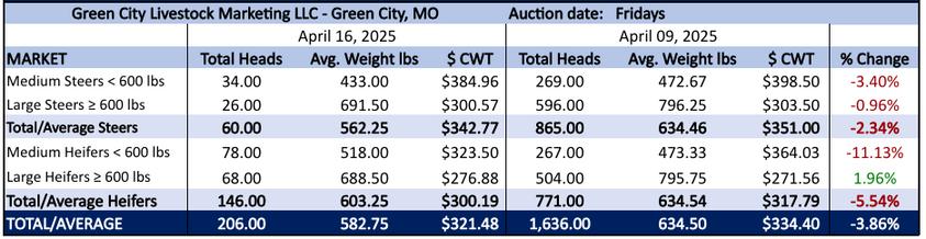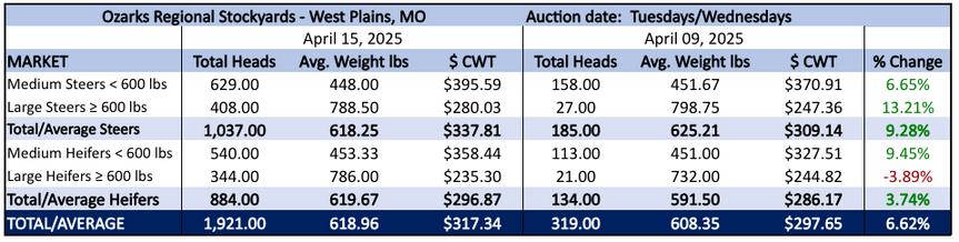 Market prices for livestock in Missouri are reported from the National Beef Wire database and USDA sources. Beef prices at live auctions report medium and large weight Classes. Steers and heifers with 599 pounds or less are medium-weight classes, and steers and heifers with 600 pounds or more are large-weight classes.