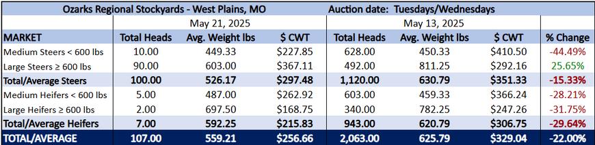 Market prices for livestock in Missouri are reported from the National Beef Wire database and USDA sources. Beef prices at live auctions report medium and large weight classes. Steers and heifers with 599 pounds or less are medium-weight classes, and steers and heifers with 600 pounds or more are large-weight classes.