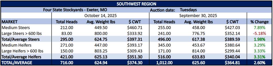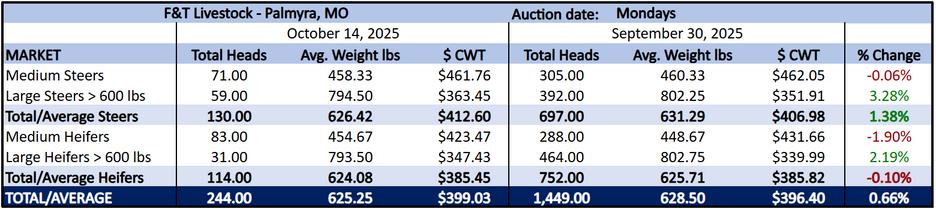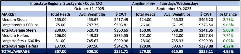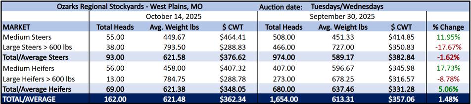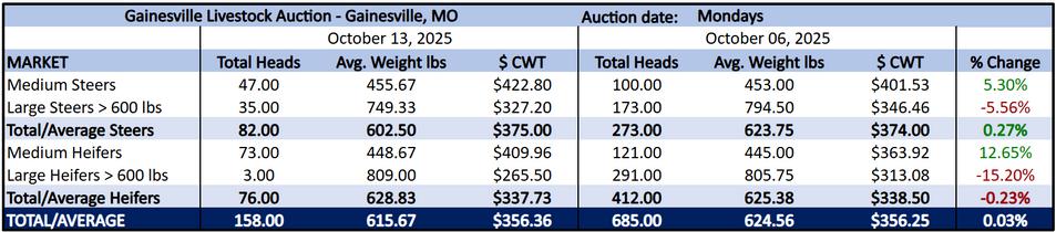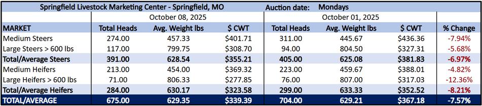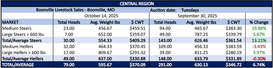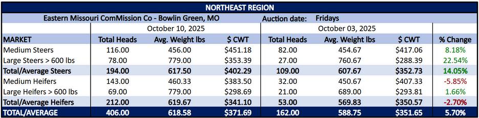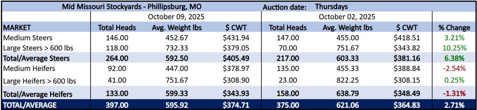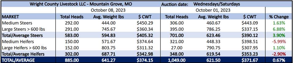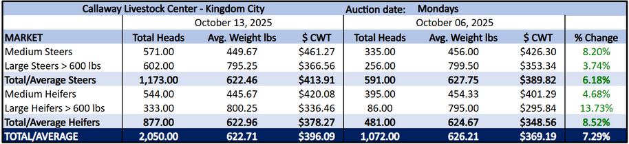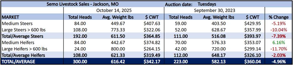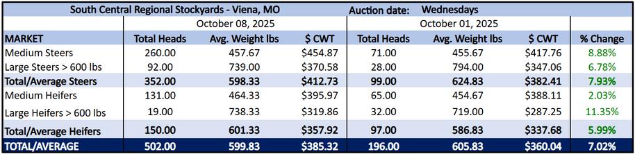 Market prices for livestock in Missouri are reported from the National Beef Wire database and USDA sources Beef prices at live auctions report medium and large weight Classes Steers and heifers with 599 pounds or less are medium-weight classes, and steers and heifers with 600 pounds or more are large-weight classes.
