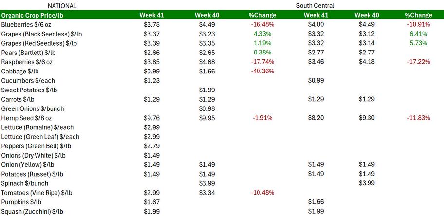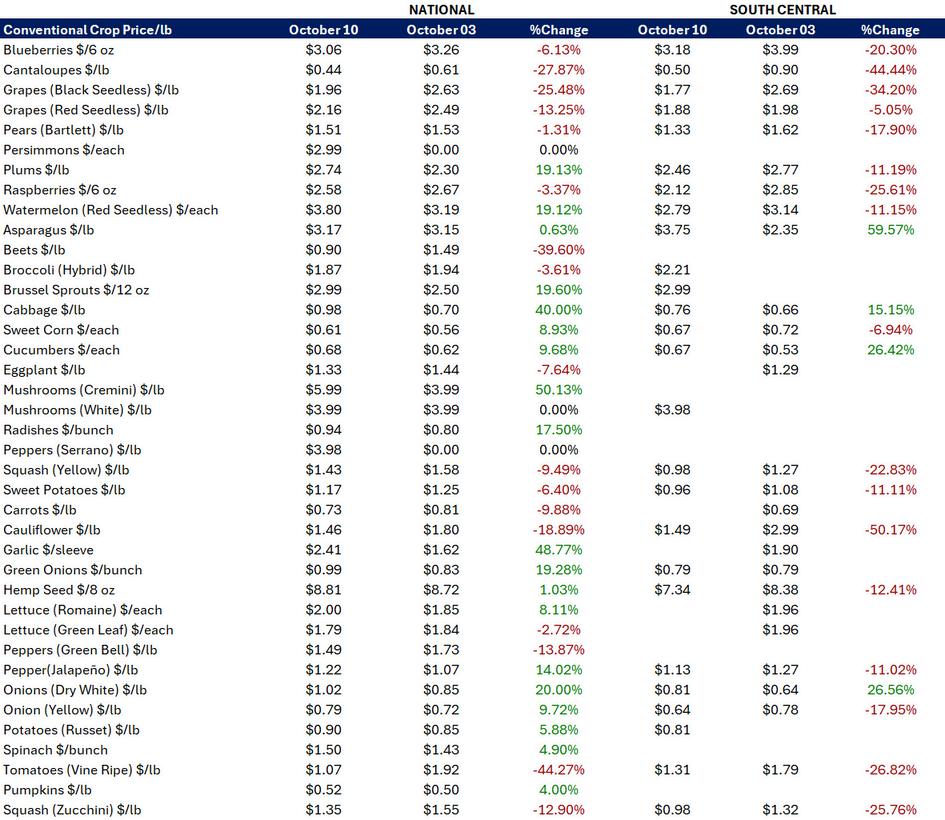 The bulletin displays market prices of selected crops that consumers demand throughout the year. This week’s publication shows specialty crop market price trends of conventional crops. Crop market prices from organic production systems were unavailable this week. Price volatility was observed among different products from non-organic growing systems. Market price reports are updated weekly; however, some of our source reports may be inconsistent with the weekly product prices. If a product has no price, our source didn't report a price that week. Red numbers imply that prices dropped from the previous week, while green numbers indicate a positive trend change compared with last week's prices.