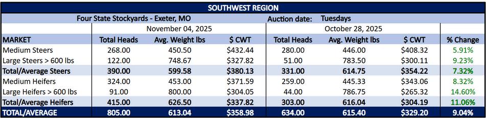This weekly bulletin aims to provide market prices and trends of the main Missouri agricultural products. It helps Missouri stakeholders, including farmers, ranchers, and consumers, make informed decisions when marketing and pricing farm products Agricultural products are categorized into two main groups: animal-origin products and plant-origin products. Prices indicate the average weekly value of each product. The bulletin offers prices for selected crops and livestock products. When data is available, this publication reports beef-livestock market prices paid at stockyards in five regions of Missouri (Southwest, Northeast, Central Region, Southeast, and Northwest) Additionally, prices for other livestock, such as sheep, goats, pork, whole milk, and eggs, are also reported when available. All information and discussion in this bulletin are the responsibility of the authors. If you want more information on the previous publication, visit our Agricultural Economics and Marketing program website