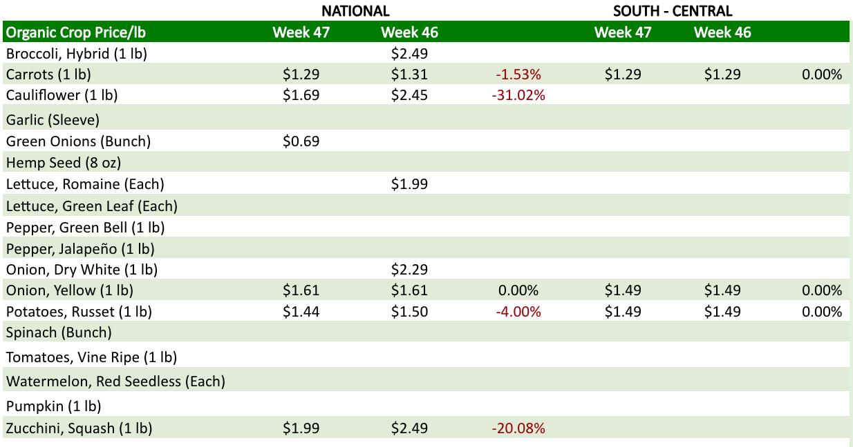 Figure 2. Market prices of organic products in the US and the SouthCentral region. Comparative sample.