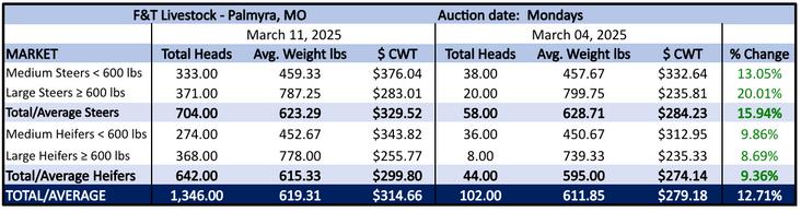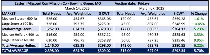 Market prices for livestock in Missouri are reported from the National Beef Wire database and USDA sources. Beef prices at live auctions report medium and large weight Classes. Steers and heifers with 599 pounds or less are medium-weight classes, and steers and heifers with 600 pounds or more are large-weight classes.