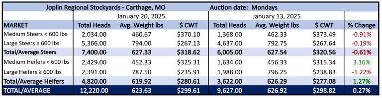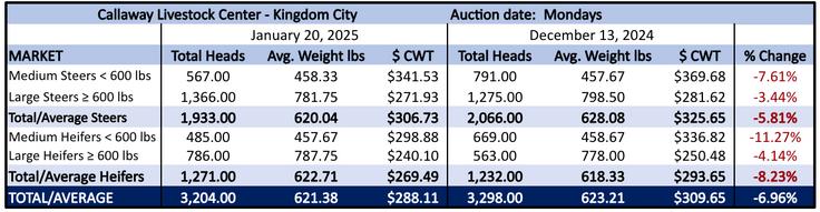 Market prices for livestock in Missouri are reported from the National Beef Wire database and USDA sources. Beef prices at live auctions report medium and large weight Classes. Steers and heifers with 599 pounds or less are medium-weight classes, and steers and heifers with 600 pounds or more are large-weight classes.