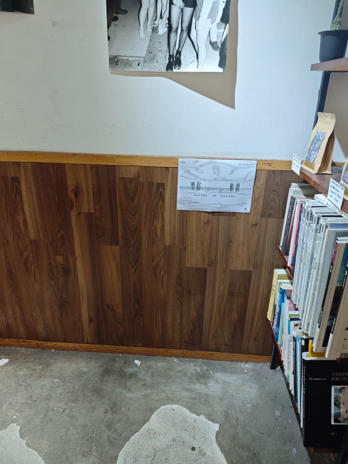 The interior decoration is in a semi-finished state, and the notices and illustrations on the floor and walls are incompatible with the atmosphere of the store.