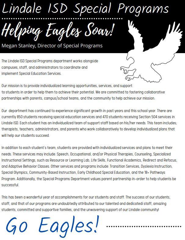 Lindale ISD is a place where we can add our uniqueness to a culture based on excellence, integrity, respect and compassion. We are a one high school district. We are all Eagles. We are a small community with big opportunities.