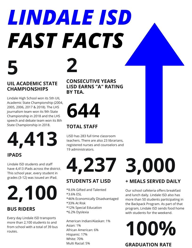 This past year, Lindale grew by more than 200 students to reach the 4,469-student enrollment mark. All indications are that Lindale ISD will continue to grow. 2022-23 was highlighted by the State Championship in UIL Military Marching. Also, a major brag for Lindale ISD was the high marks from the Texas Education Agency. Lindale ISD was the only school district in the Smith County area to earn an "A" rating for all campuses and for the district.