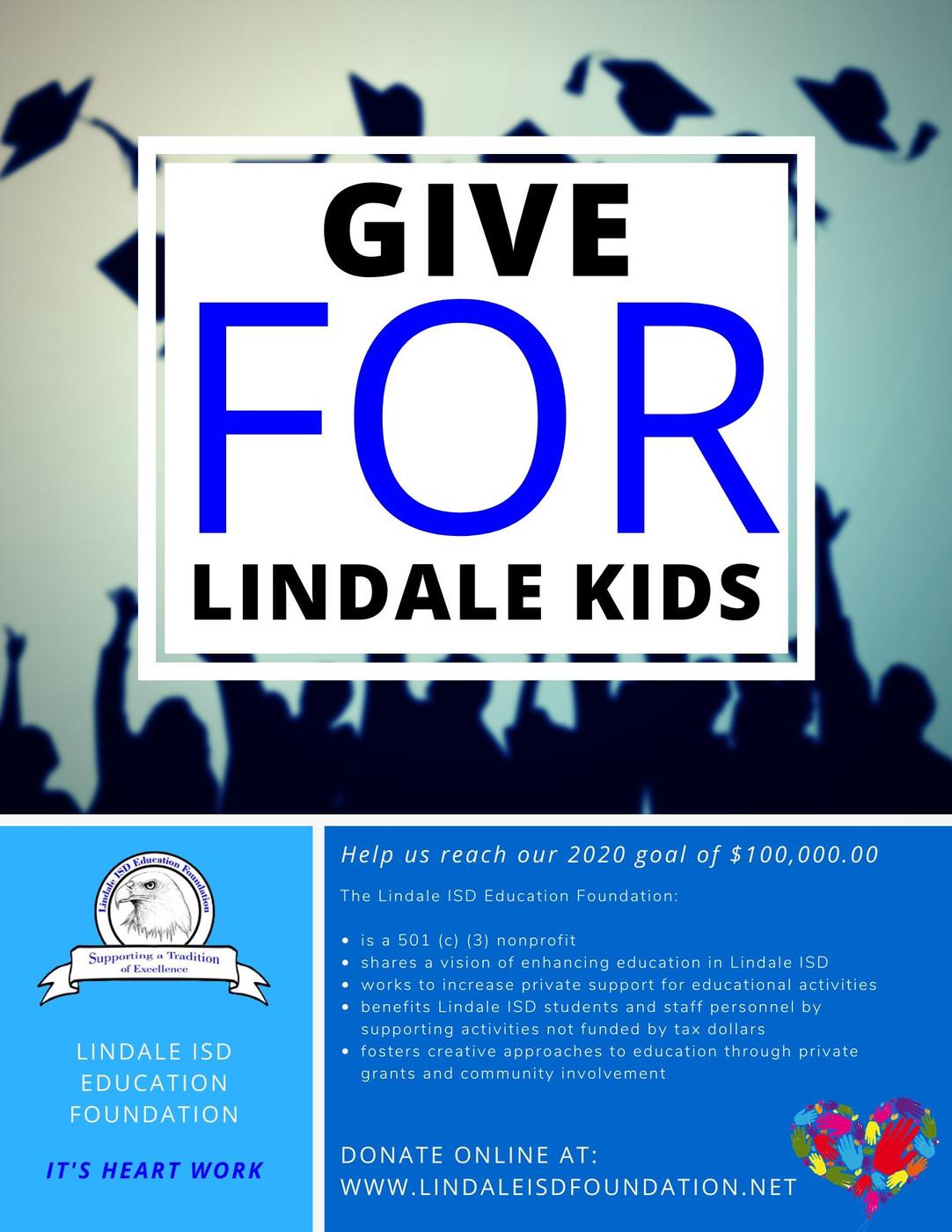The Grants for Great Ideas Program is designed to encourage, facilitate, recognize and reward innovative and creative instructional approaches for the accomplishment of program objectives. Such initiatives will provide enrichment, research opportunities, training, intervention and prevention strategies and extend the educational effort. Funds provided by the Foundation will directly benefit students in the Lindale Independent School District and will make a positive difference for them. Donations remain in the school district and thus benefit the entire community through an investment in education and quality of life.