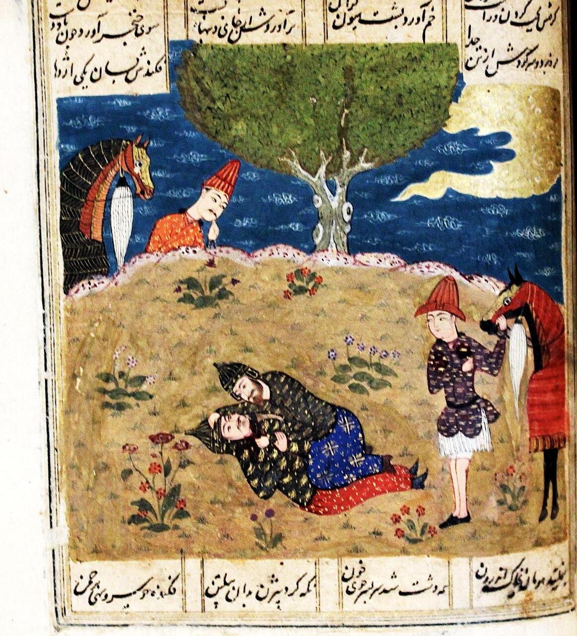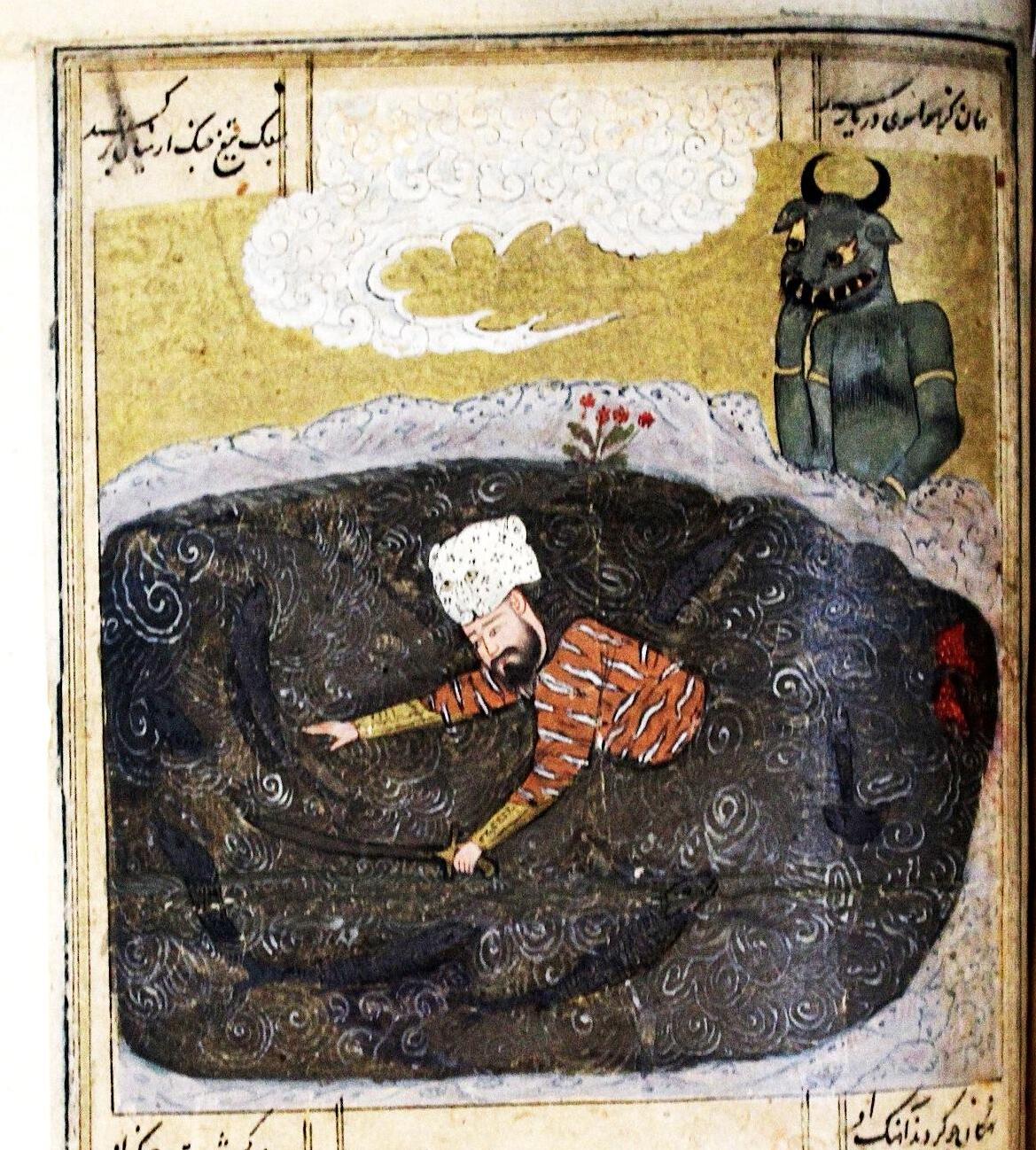 In the Persian epic of Shahnameh, Div- e Sepid (White Demon/Div) is the chieftain of the Deevs of Mazandaran. He is a huge being and is skilled in sorcery. He destroys the army of Kay Kavus by conjuring a dark storm of hail, boulders, and tree trunks. He then captures Kay Kavus, his commanders, and paladins; he blinds them and imprisons them in a dungeon. The greatest Persian mythical hero Rostam undertakes his “Seven Labours” to free his sovereign. In the end, Rostam slays Deev-e Sefid and uses his heart and blood to cure the blindness of the king and the captured Persian heroes. Rostam also takes the Deev’s head as a helmet and is often pictured wearing it as in the following pages.