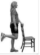 4. En la misma posición detrás de la silla, se coloca todo el peso en el talón del pie y luego se regresa a la posición inicial. 10 repeticiones.