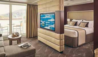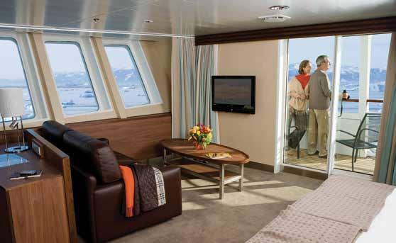 CATEGORY 6: Veranda Deck–Suite #101, 102 Cabins face outside with three large windows and feature a separate seating area and pull-out sofa. Upper Deck-Suite #213 Cabin faces outside with a private balcony and features a separate seating area.