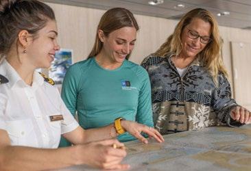 Attend a naturalist talk in the lounge or take advantage of the ship’s amenities: read up on geology in the library, test out hightech cameras from the complimentary OM System Photo Gear Locker or visit the open Bridge to chat with the captain about Arctic navigation. Young travelers in the National Geographic Explorers-in-Training program are invited to join their certified field educator in using the ship microscopes to examine plankton gathered on the morning Zodiac cruise.