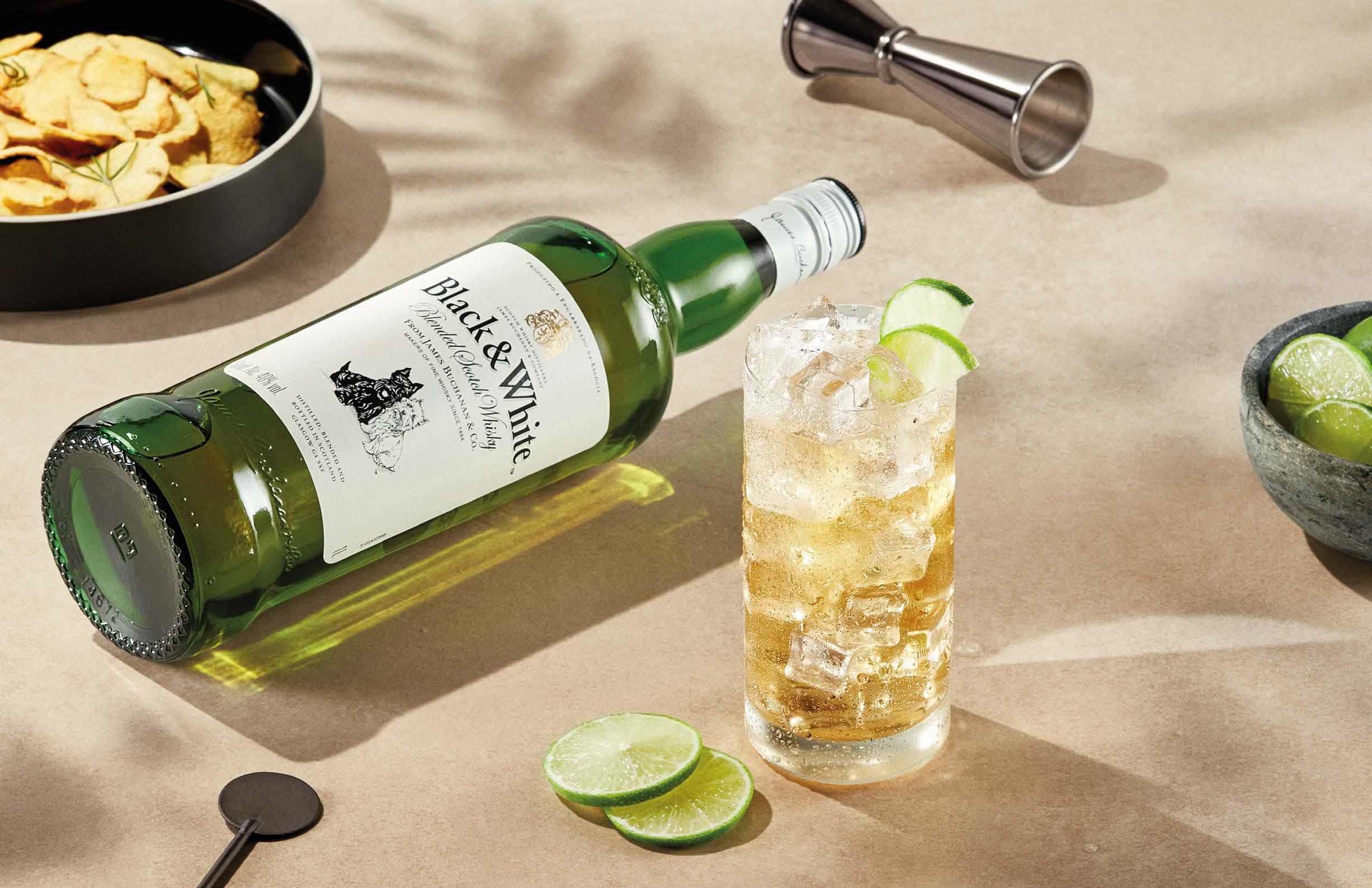 Llenar un vaso highball (alto) con mucho hielo. Agregar 50ml o 1.75 oz de Black & White y completar con Ginger Ale. Revolver e incorporar bien todos los ingredientes con la ayuda de una cucharilla.