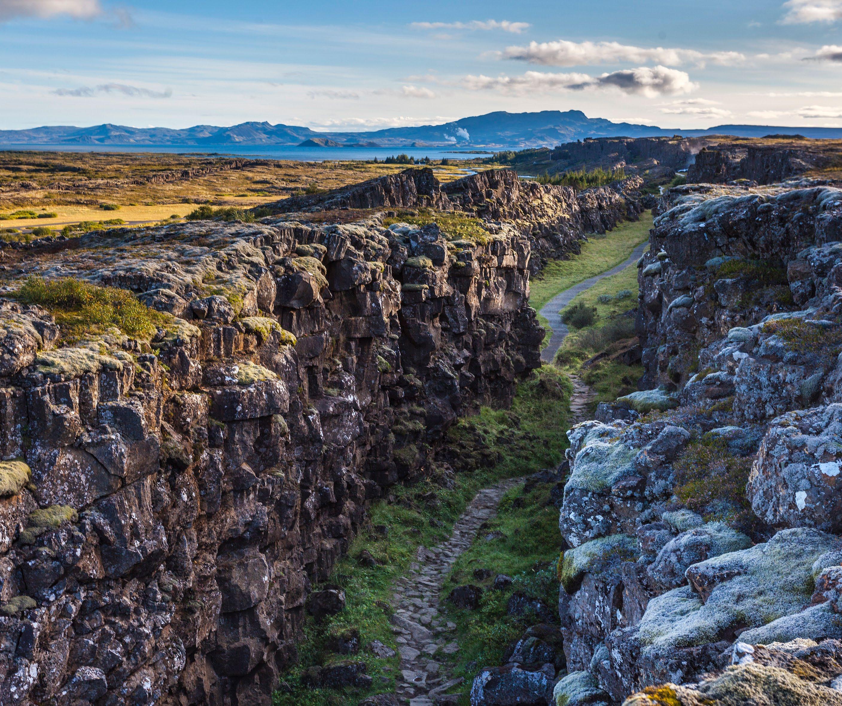 Los mágicos paisajes de Þingvellir se forman en el entorno geográfico único de un valle del rift en la división entre las placas continentales norteamericana y euroasiática. Los campos de lava de Þingvellir son destrozados por fuerzas tectónicas, dejando admirables desfiladeros y fisuras. El más impresionante de ellos, Almannagjá, es el punto central del parque nacional. Una ruta de senderismo