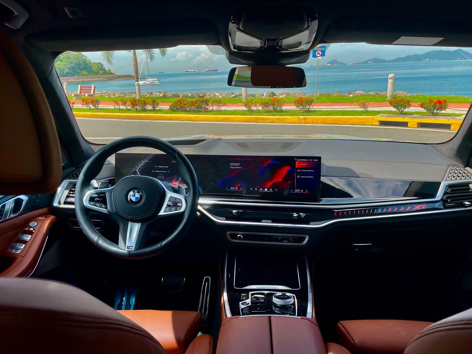 seis o siete ocupantes en tres filas. Los frontales me soportan bien y me sujetan mejor, siendo muy confortables. Hay espacio para cabeza y piernas para botar en la primera y segunda fila. La visibilidad sobre el capó es excelente por la forma cuadrada del SAV y lo alto que se ubican las butacas frontales. Si equipado con suspensión adaptativa y de aire opcional, el auto desciende para facilitar ingreso y egreso. El volante M posee levas en el mismo y es multifuncional en su accionar.