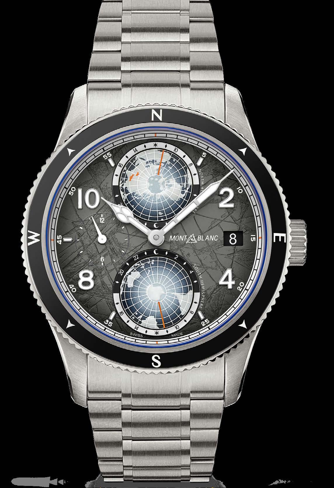 Cronógrafo de tiempo mundial de coordinación a tiempo atómico por radio, control de la edición Blue Angels da el tiempo automático de 26 ciudades, cronometro de 1/20 de segundo y hasta 60 minutos, calendario perpetuo, indicador de 12/24hrs, reserva de marcha bajo cristal de zafiro antireflejante en acero inoxidable platinado con azul y correa de piel.