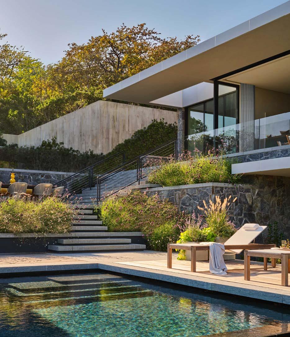 aterrazadas continúa este ritmo descendente, que se extiende desde el interior hasta el jardín, la piscina y la caseta de la piscina. El descenso natural del terreno se refleja en esta secuencia espacial, reforzando la continuidad entre la arquitectura y el terreno.
