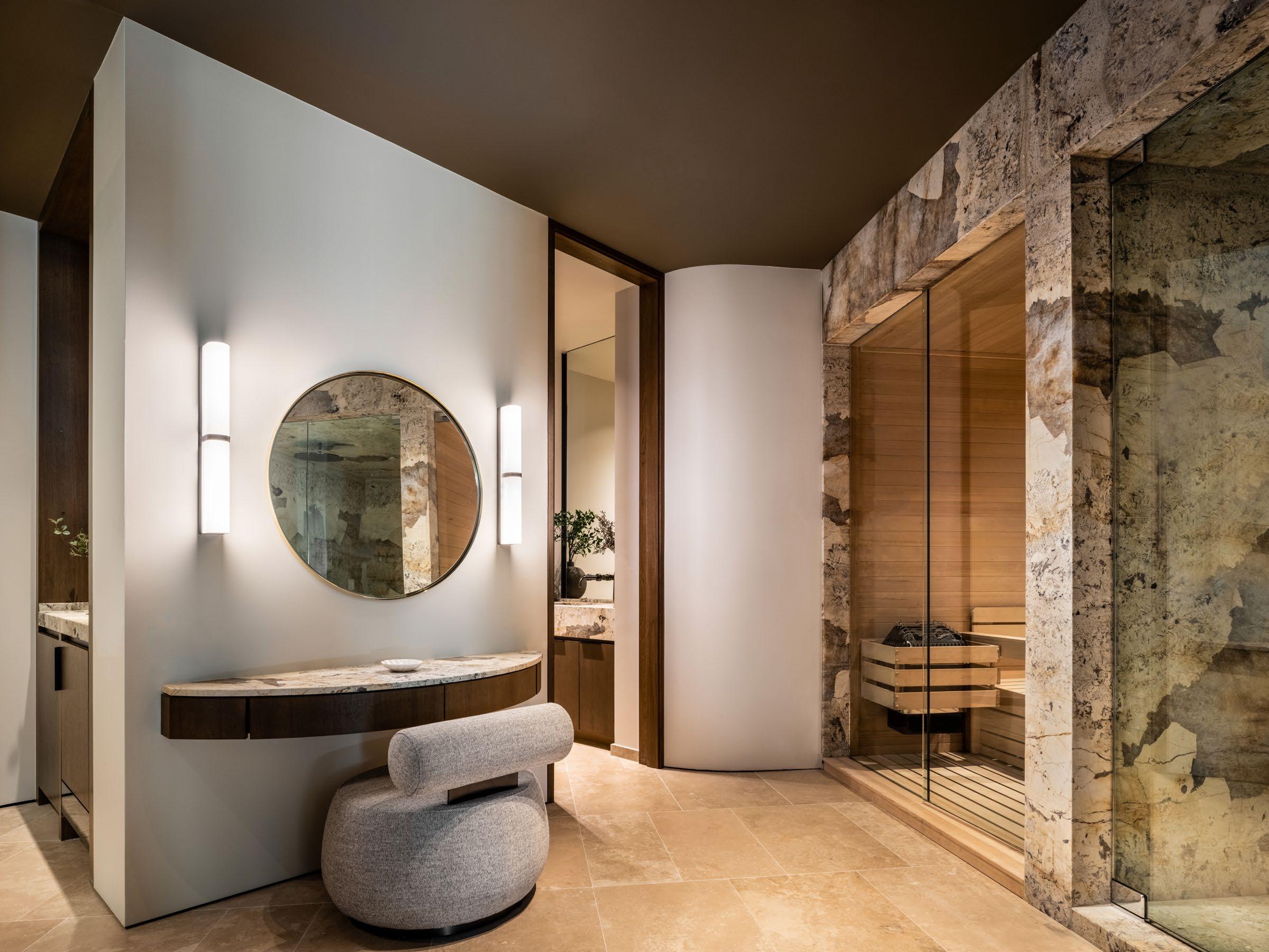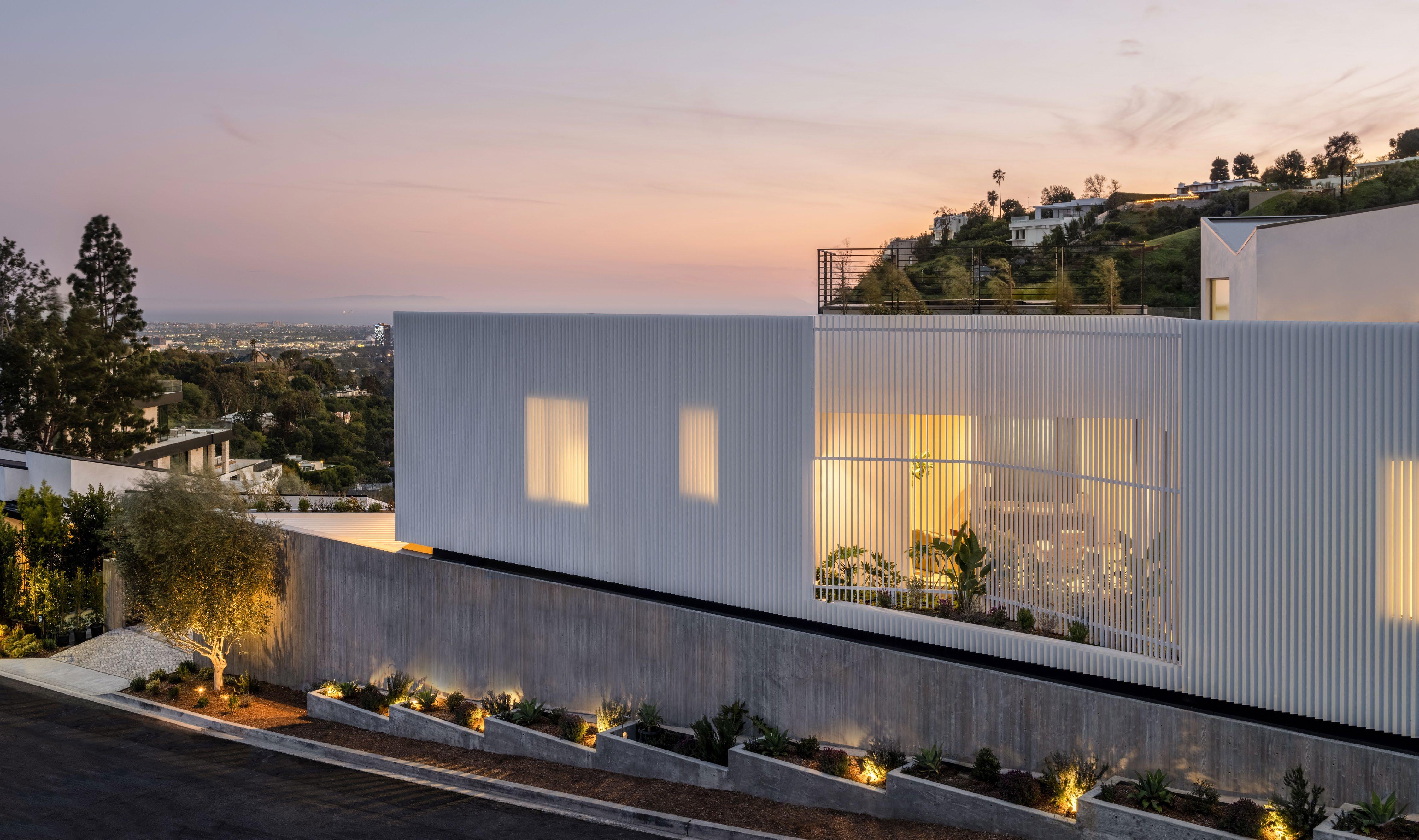 Al ingresar a la propiedad, el carácter arquitectónico cambia. Las líneas limpias persisten pero ahora están fragmentadas, con paredes masivas en ángulo que guían a los visitantes hacia la entrada.