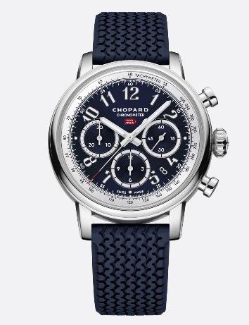 Chopard rinde homenaje a la icónica figura de las carreras Jacky Ickx con el Mille Miglia Classic Chronograph JX7, una colaboración entre el copresidente de Chopard, Karl-Friedrich Scheufele, y el propio Ickx. El reloj rinde homenaje al legado de Ickx con elementos de diseño inspirados en su legendario casco, en particular su color azul medianoche y sus distintivas rayas blancas. Está coronado por una magnífica caja de cristal y, por primera vez, también incorpora la correa de caucho con el dibujo del neumático Dunlop característico de la colección Mille Miglia en un tono azul noche a juego con la esfera. La esfera cuenta con Super-LumiNova® para mayor visibilidad e incorpora guiños a las victorias de Ickx en Le Mans. El cristal de zafiro tipo “caja de cristal” aporta profundidad a la esfera, mientras que el fondo de exposición revela el movimiento de cronómetro suizo de precisión. Diámetro 40.5 mm.