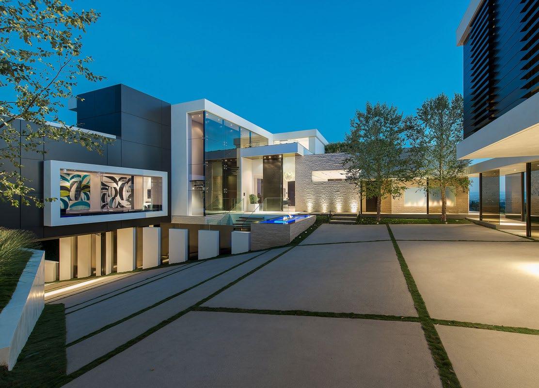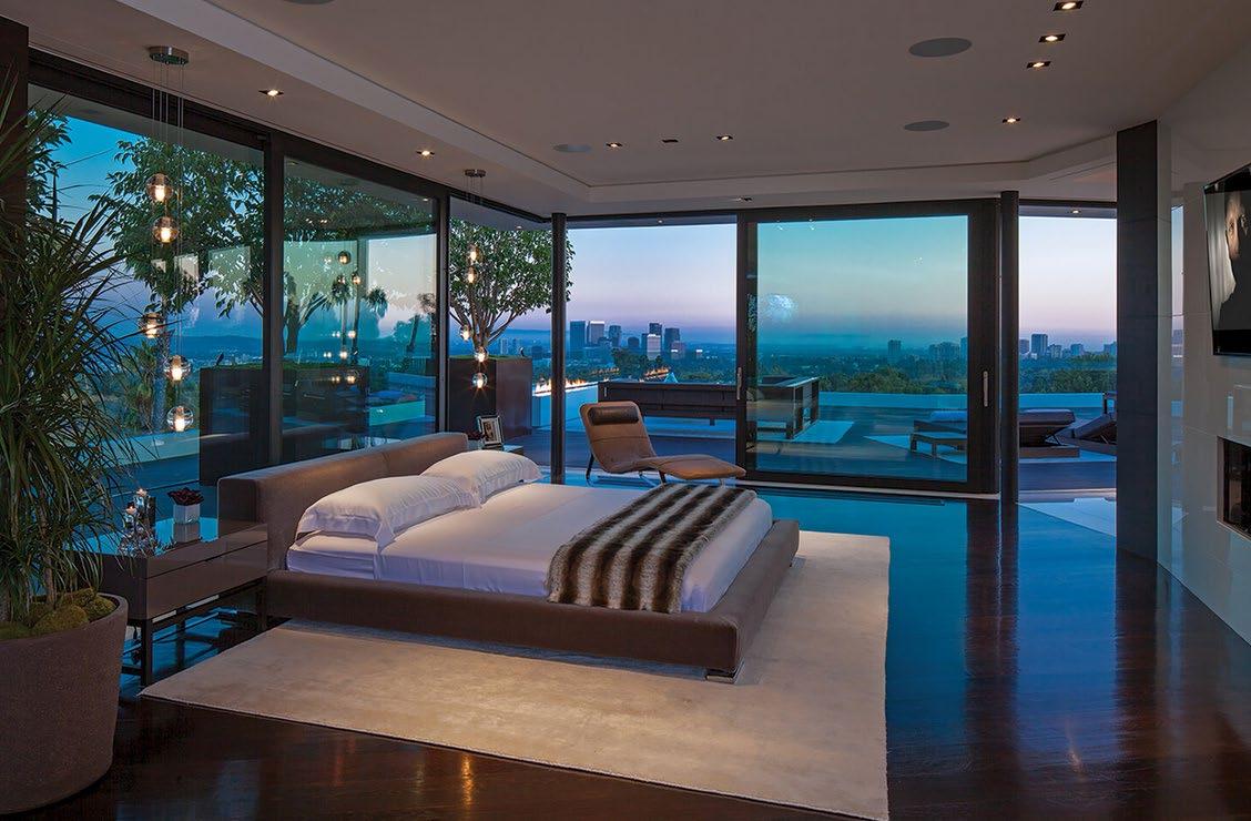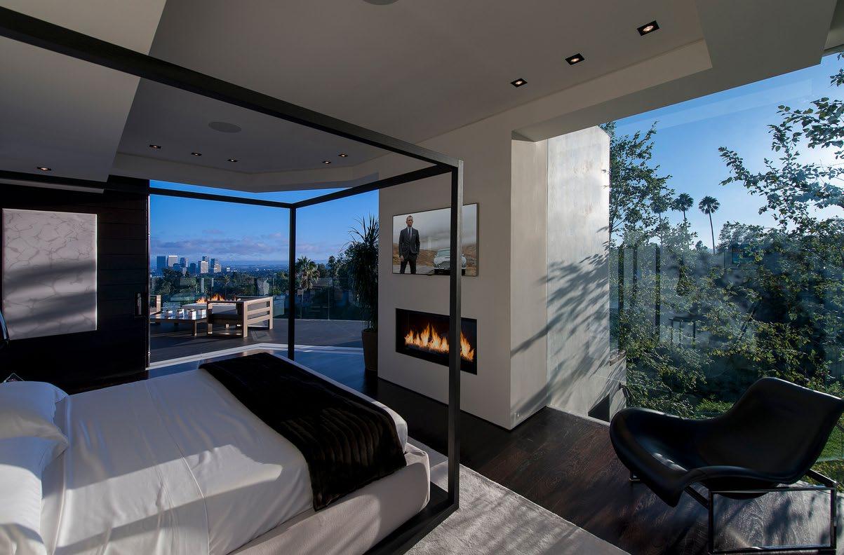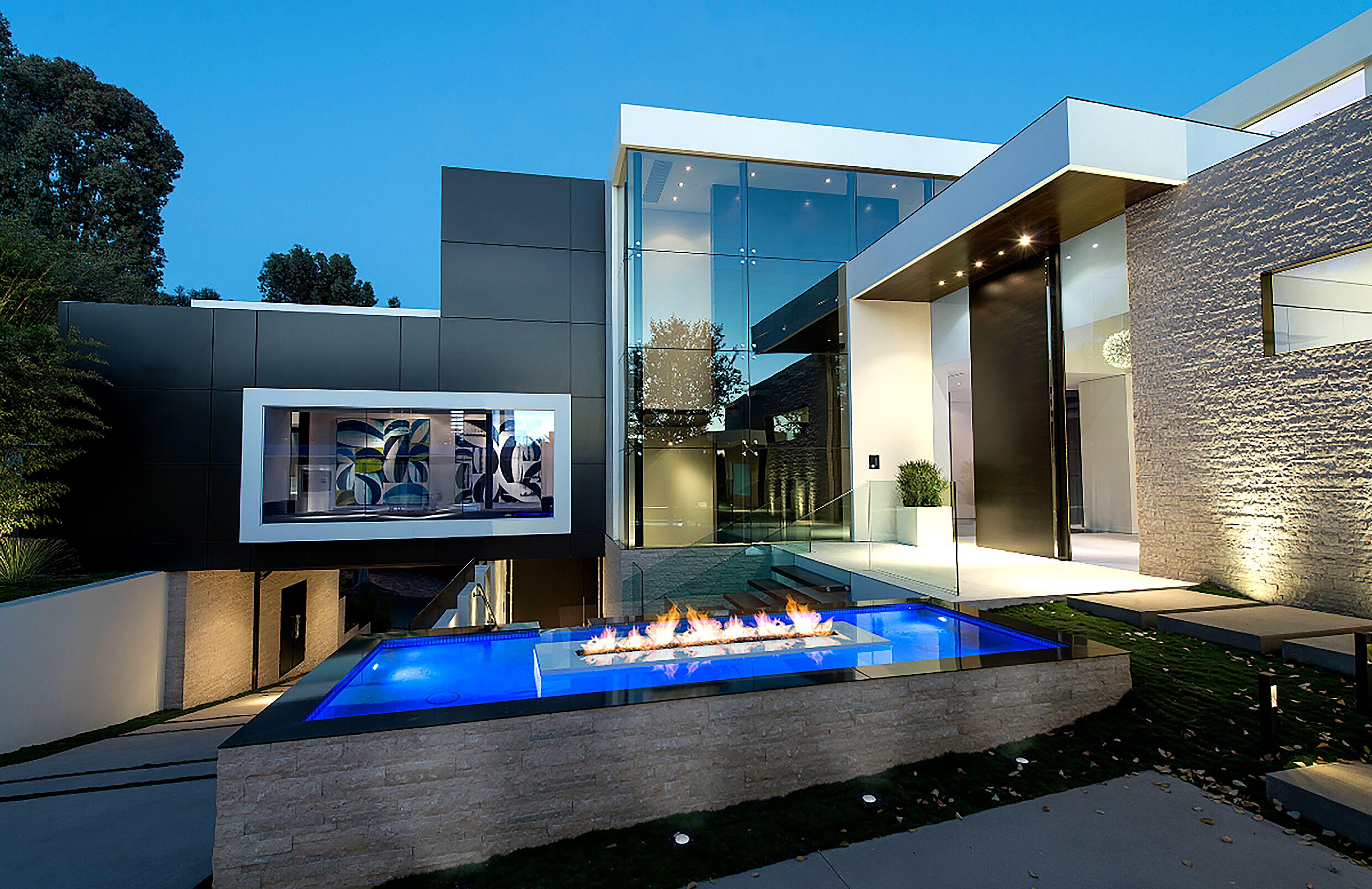 La construcción sin bordes de la piscina y el spa atrae la mirada hacia el horizonte (Los Angeles, California) un espejo perfecto incrustado en el paisaje. El fuego y agua, los elementos básicos, están aquí en abundancia, con características de llamas en todas partes.
