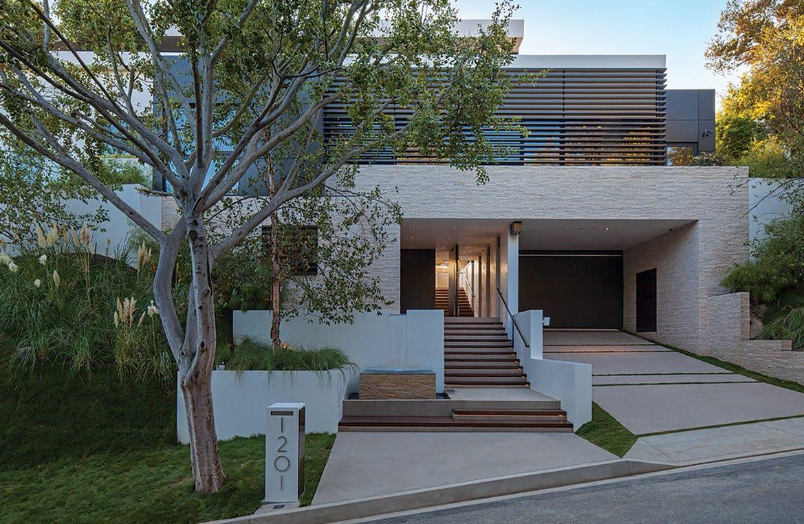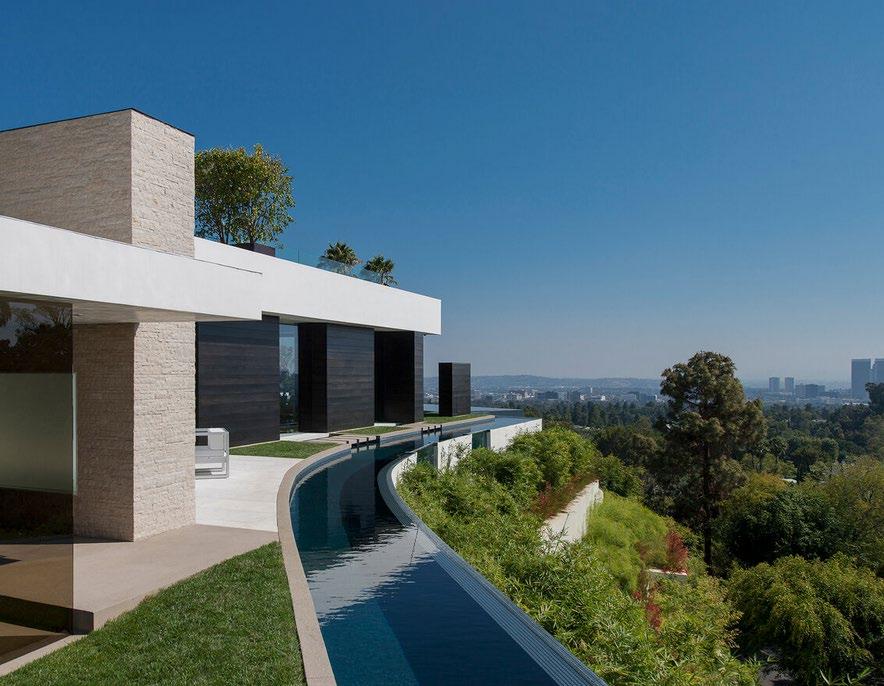 encuentran con los techos, se deja un espacio de media pulgada, lo que ayuda a lograr el efecto. Estos elementos juegan con las horizontales y verticales de la casa, mientras que el movimiento y las curvas provienen de los tres niveles de vegetación y los dos canales de agua que rodean la casa. Dándole el aspecto de una isla flotando contra el cielo azul de California. El entorno de agua en forma de foso es más que una inspiración artística exitosa; agrega la sensación de un límite protector, sin obstruir las vistas de ninguna manera. También proporcionó una característica de agua innovadora que es visible desde el interior, agregando una dinámica muy dramática a todo el diseño. Los escalones