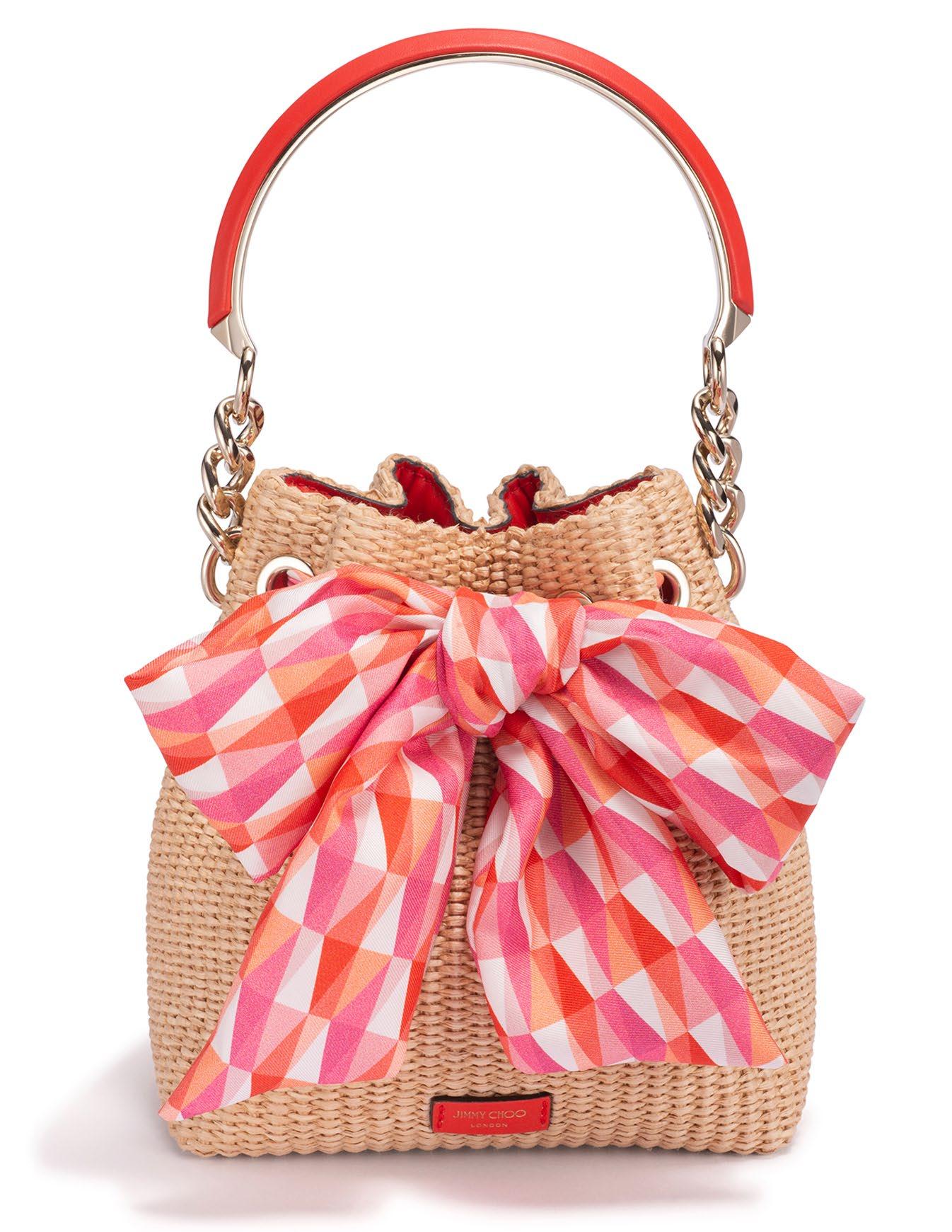 El pequeño bolso Bon Bon Bucket es una elegante pieza de estilo vacacional adornado con un lazo de satin.