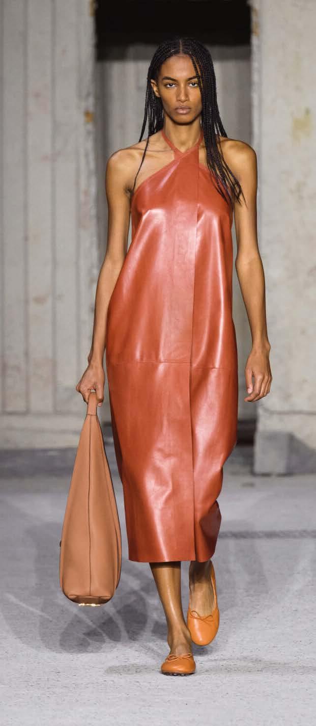 cueros brillantes, ajustes de segun da piel y micro shorts. Las prendas esenciales para el día a día -cami setas de tirantes, cuellos de polo, le ggings- parecen casi perversas en su simplicidad. Las prendas de pun to ligero se tejen a lo ancho para revelar la piel que hay debajo, o son tan finas que parecen translú cidas. Incluso los trajes de noche están impregnados de despreo cupación. En los brillantes zapatos rojos que Ferragamo hizo para Ma rilyn Monroe en 1959, la colección aparece salpicada de cristales: los de Hollywood, el brillo y el glamour refractados de nuevo. La sastrería retuerce los tropos clásicamente masculinos de los ejecutivos de los ochenta para convertirlos en un vestuario moderno.