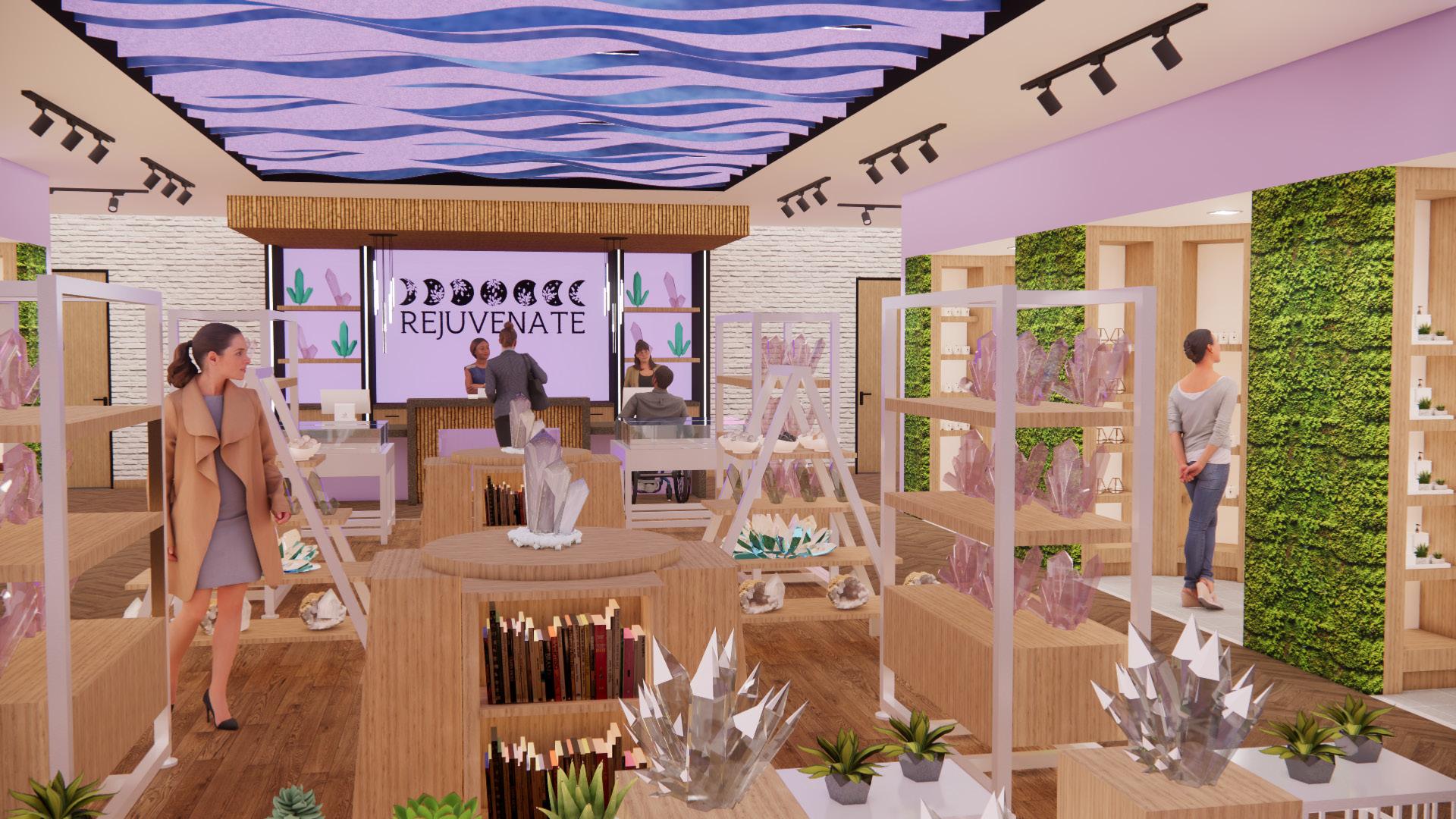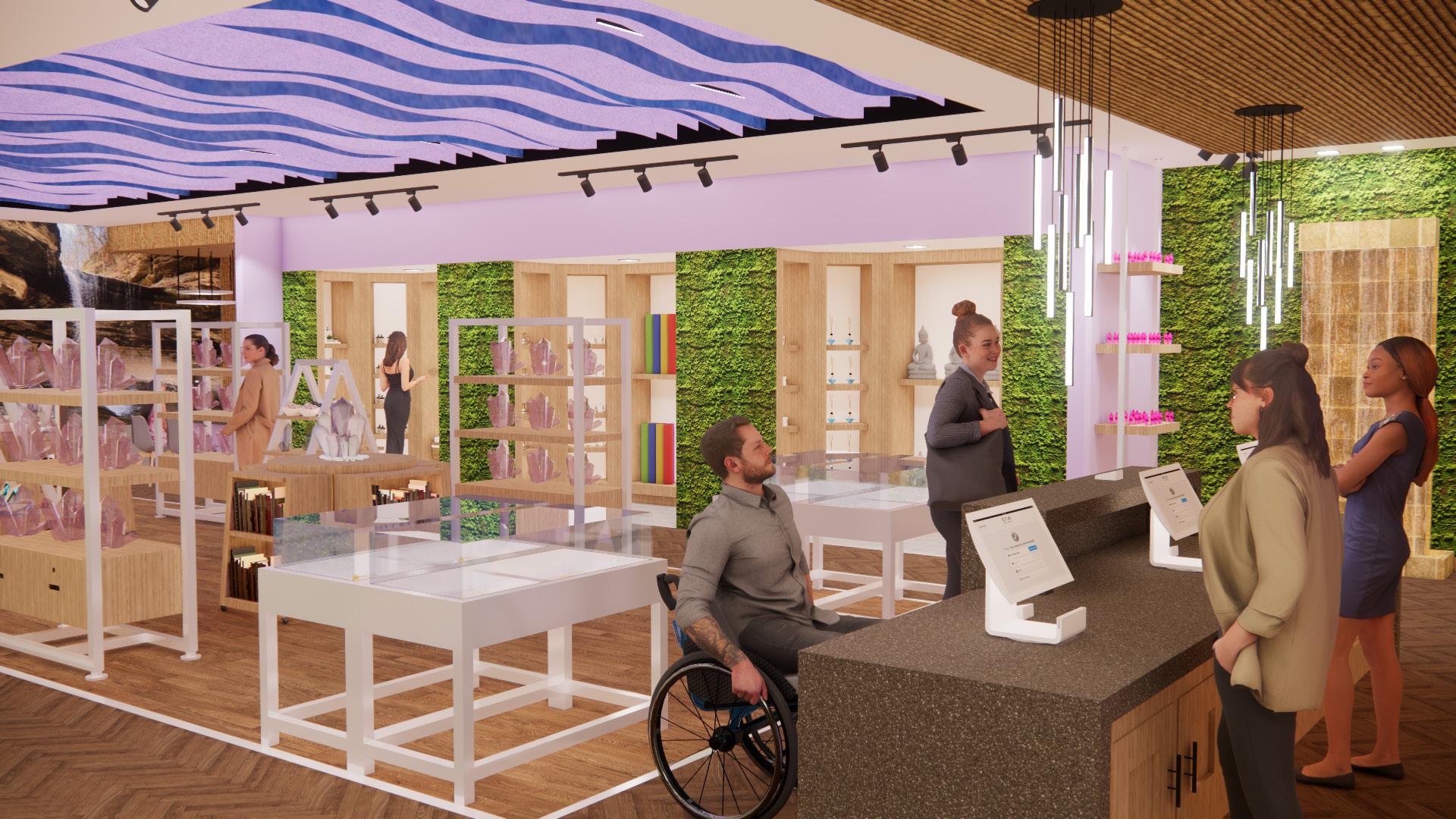 The branding color purple was chosen to provide a calming atmosphere when patrons enter the experiential retail environment.