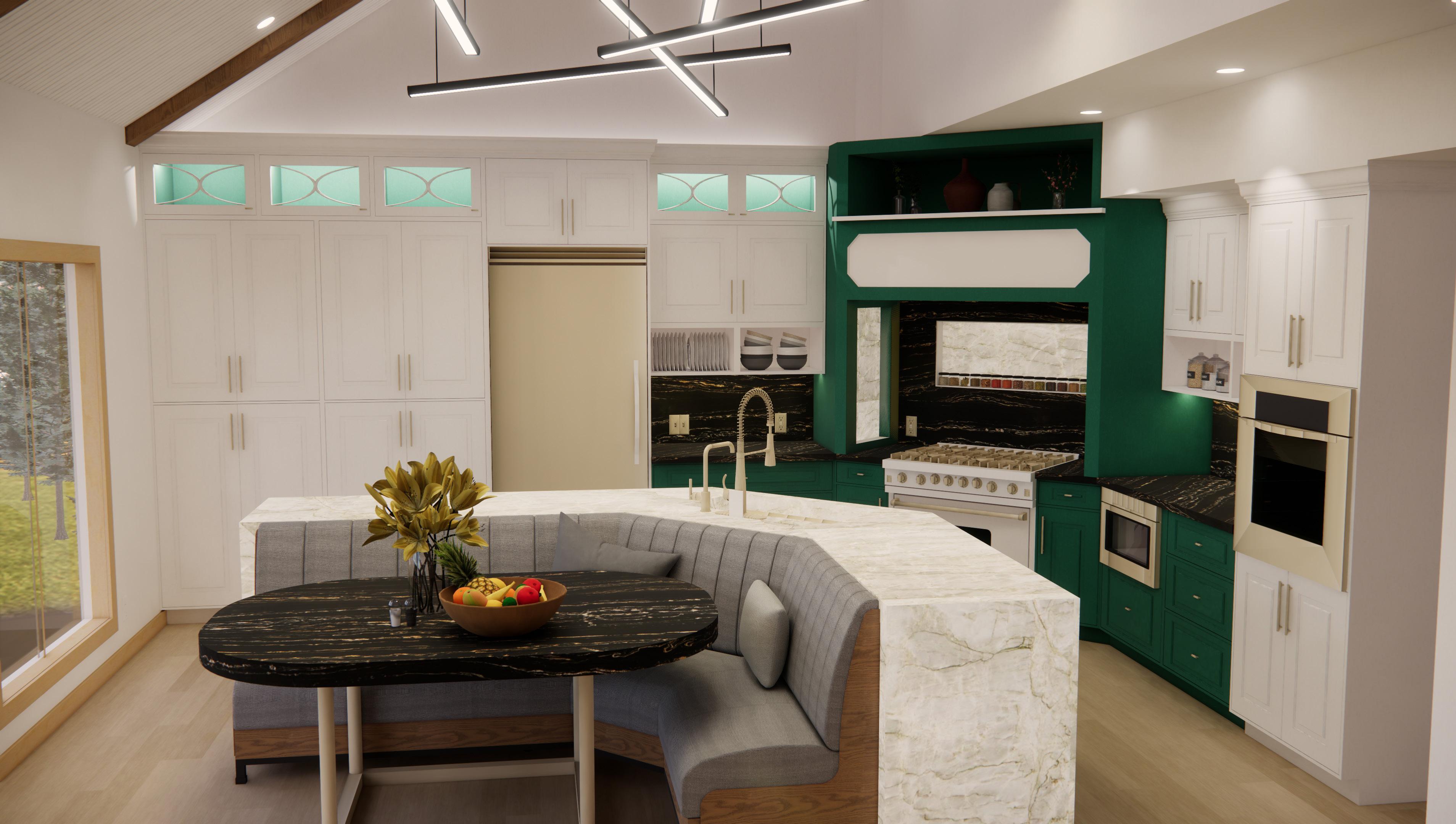 - Banquette with a table attached to island to have seating area, use excess space, and make a cozier spot for the family to gather