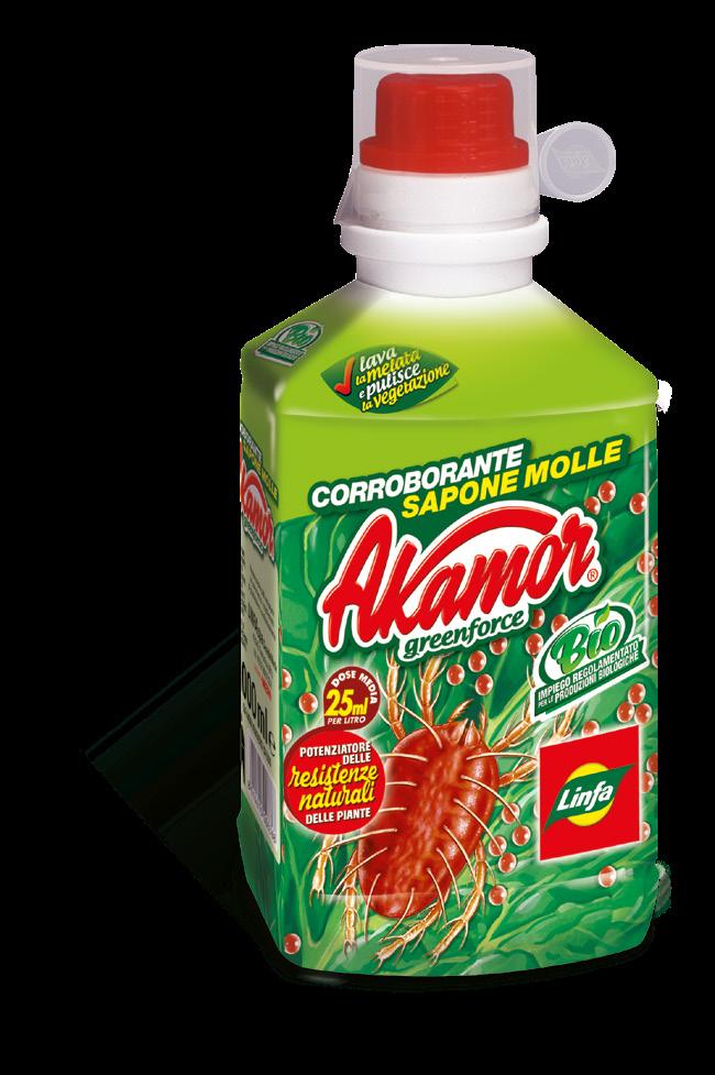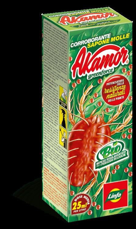 Caratteristiche - Formulato liquido a base di sali potassici di acidi grassi di origine esclusivamente vegetale ottenuto dalla saponificazione di acido oleico, Akamor GF è in grado di attivare le naturali difese delle piante contro stress di varia natura (azione corroborante) e migliorarne la resistenza, in ogni stadio del loro sviluppo, nei confronti del Ragnetto rosso comune (Tetranychus urticae, molto aggressivo sulla maggior parte delle colture orticole), del Ragnetto rosso dei fruttiferi (Panonychus ulmi), del Ragnetto giallo della vite (Eotetranychus carpini) e degli Eriofidi (come l’Eriofide della vite e l’Eriofide vescicoloso del pero). Il suo elevato potere detergente e sgrassante ha inoltre la capacità di pulire la vegetazione, in particolare dalla melata, prevenendo l’insorgere di funghi patogeni - come le fumaggini - che provocano l’annerimento delle foglie limitando la fotosintesi. Il prodotto non lascia residui sulle colture ed è ammesso per l’impiego in agricoltura biologica. Teme il gelo.