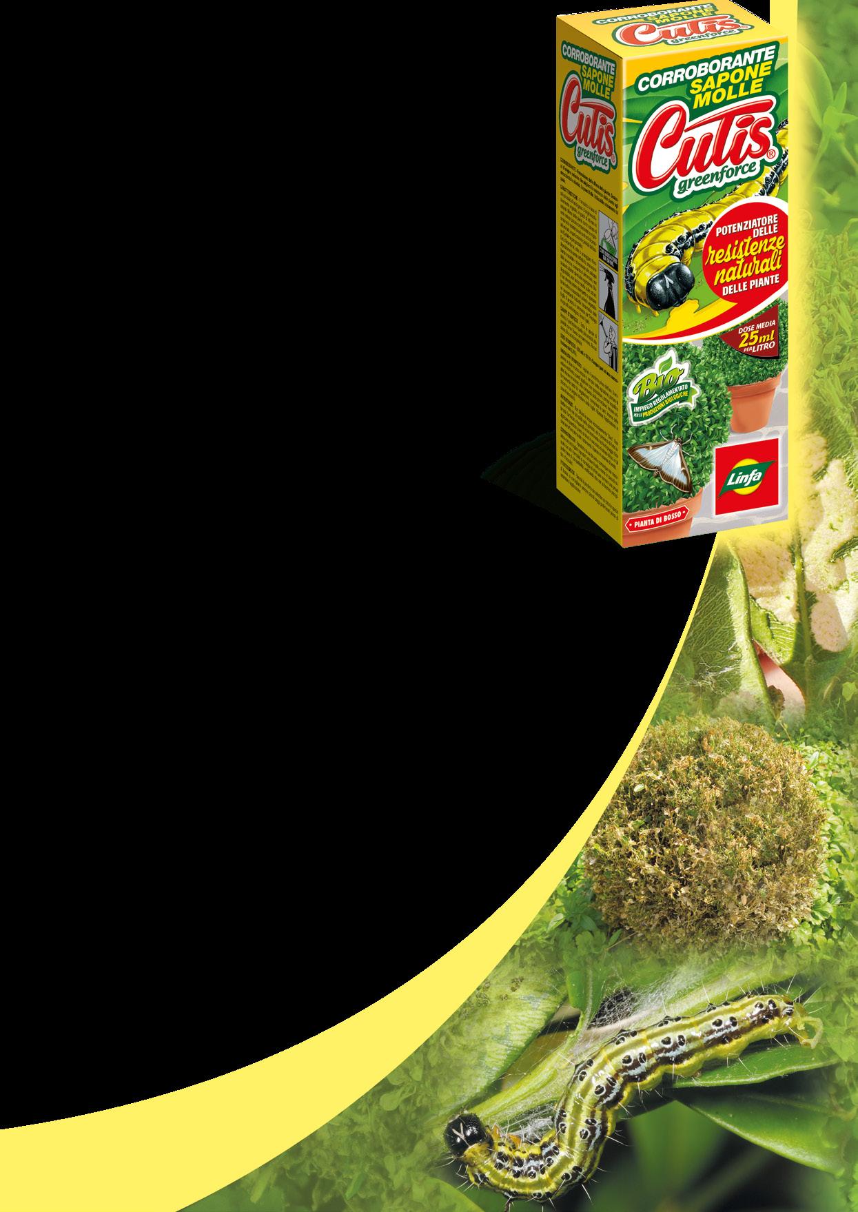 Composizione - Soluzione di sali di potassio di acidi grassi min. 14%. UFI: Y910-H0V4-E00N-KEDT Caratteristiche - Formulato a base del sale potassico dell’acido oleico (C18 di origine esclusivamente vegetale) in grado di attivare le naturali difese delle piante contro stress di varia natura (azione corroborante) e migliorandone la resistenza nei confronti di parassiti animali, in particolare la piralide del bosso (Cydalima perspectalis), lepidottero di piccole dimensioni che si è diffuso progressivamente in tutta l’Italia del Nord e che allo stadio di larva defoglia voracemente le piante di Bosso (Buxus spp.). Cutis Greenforce, oltre a scoraggiare l’ovideposizione da parte dell’adulto, crea un ambiente inospitale e sfavorevole allo sviluppo delle larve che, cessando di alimentarsi, non causano ulteriori danni alla vegetazione. Biodegradabile, non lascia residui sulle colture. Il suo elevato potere detergente e sgrassante ha inoltre la capacità di pulire la vegetazione aumentando l’attività fotosintetica delle foglie. Il prodotto è ammesso per l’impiego in agricoltura biologica. Campi d’impiego - Tutte le specie di bosso, in particolare Buxus sempervirens (in particolare la var. “rotundifolia”), il bosso Coreano (Buxus sinica), il bosso Giapponese (Buxus microphylla e Buxus microphylla var. “insularis”) e il bosso del Caucaso (Buxus colchica).