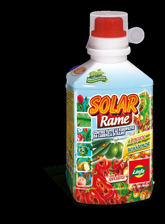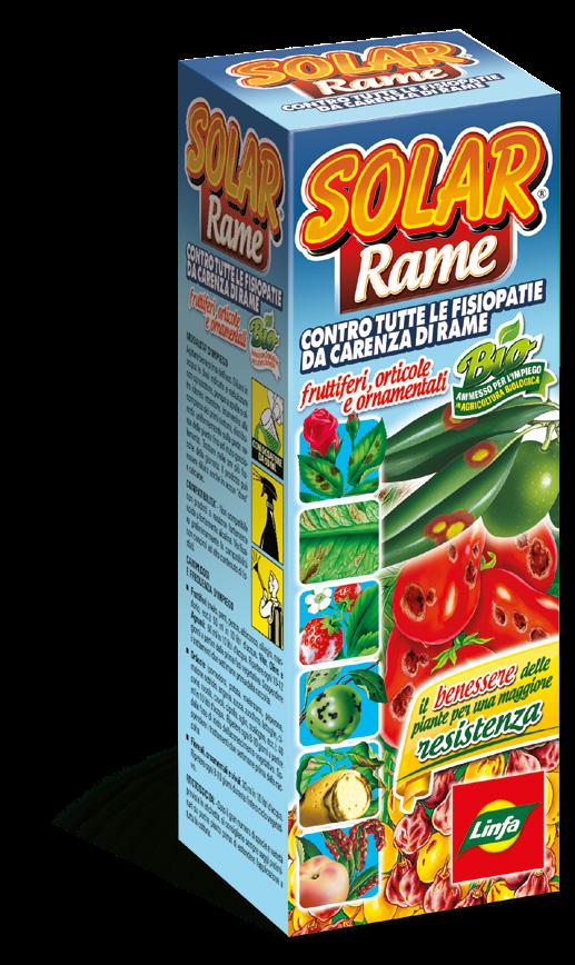 Caratteristiche - Specialità liquida studiata espressamente contro tutte le fisiopatie da carenza di rame (crescita lenta e stentata della pianta, necrosi marginali, arricciamento del fogliame e deformazione dei frutti) e, secondariamente, di zinco e manganese. Il formulato contiene acido lignosolfonico (LS), sostanza di origine vegetale estratta dalla lignina (polpa di legno); grazie alla sua elevata capacità “complessante” e all’elevata affinità biologica per i tessuti vegetali, facilita la più uniforme distribuzione dei microelementi, il loro più rapido assorbimento (2/3 ore dall’applicazione) e la loro veloce traslocazione. L’azione è sinergizzata da amminoacidi vegetali che conferiscono al prodotto anche un’azione collaterale contro gli stress termici e idrici. Solar Rame stimola i processi enzimatici, la produzione di lignina e contribuisce al benessere generale delle piante che pertanto si dimostrano più resistenti e in grado di superare più velocemente le avversità di qualsiasi natura. Solar Rame è ammesso per l’impiego in agricoltura biologica.