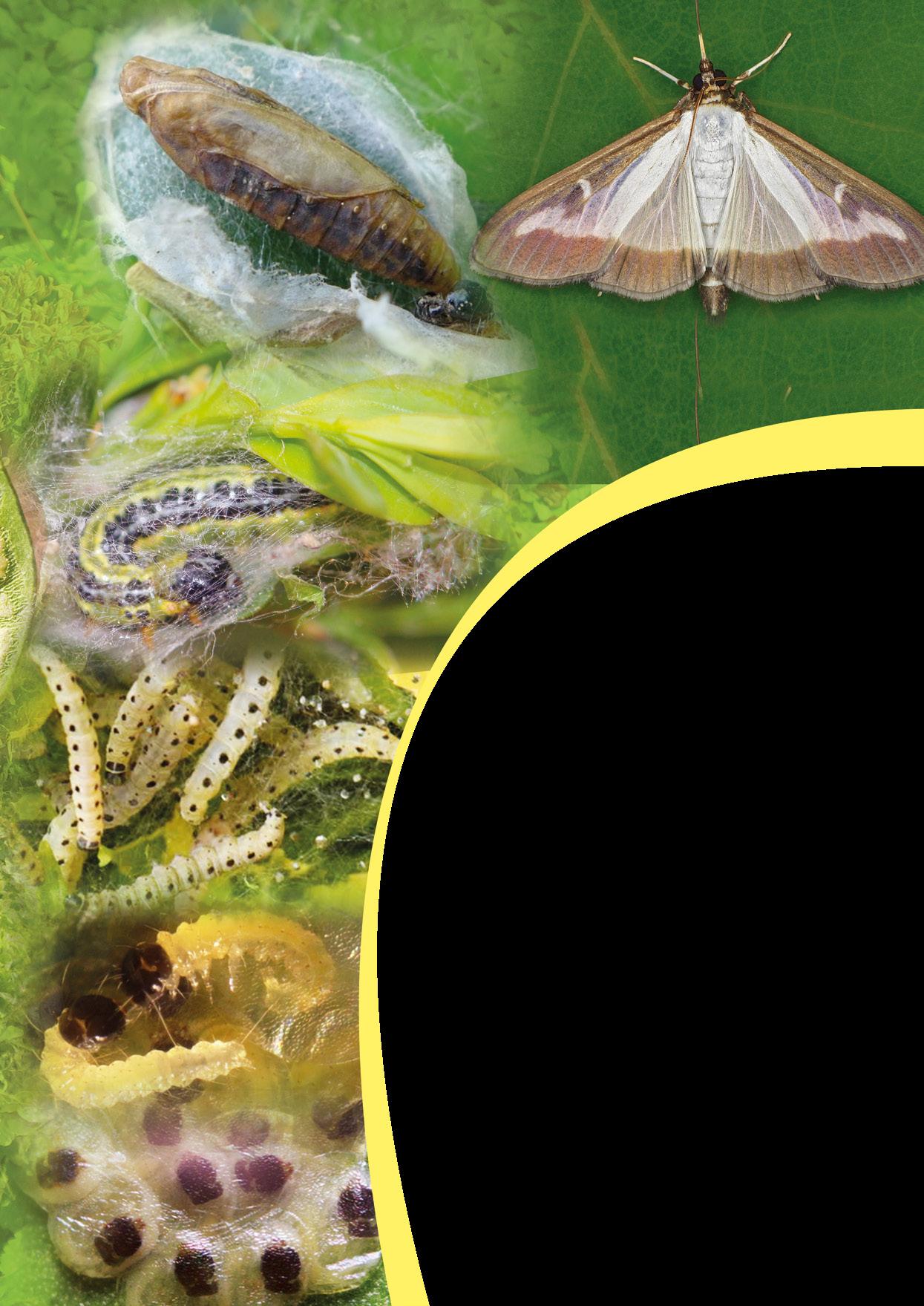 Danni - Le larve della piralide si sviluppano esclusivamente sulle piante di bosso (Buxus spp.). Particolarmente voraci, si nutrono di foglie, germogli, corteccia ancora verde e, occasionalmente, dei giovani rametti, causando gravi danni estetici e fisiologici, sia nei vivai, sia sulle siepi. Le erosioni fogliari causate dalle larve di prima età sono caratteristiche perché l’epidermide della pagina superiore delle foglie rimane integra mentre quella della pagina inferiore viene del tutto erosa. A partire dalla terza età, le larve si nutrono a spese di tutta la foglia erodendo completamente il lembo fogliare ma rispettando le nervature. Le piante di bosso attaccate evidenziano inoltre un caratteristico intreccio di fili sericei tra foglie e rametti dove rimangono intrappolati escrementi e residui (esuvie) delle mute larvali. Le piante colpite manifestano un rapido mutamento dell’aspetto che perde il caratteristico colore verde intenso per manifestare disseccamenti più o meno diffusi e una colorazione ocracea tipica di foglie che hanno perduto la capacità fotosintetica. Forti infestazioni portano a gravi defogliazioni delle piante con un danno estetico considerevole; con il passare del tempo la rilevante defogliazione porta alla perdita completa del portamento caratteristico delle piante, ne causa un grave deperimento che, a lungo termine, determina la morte dell’esemplare.