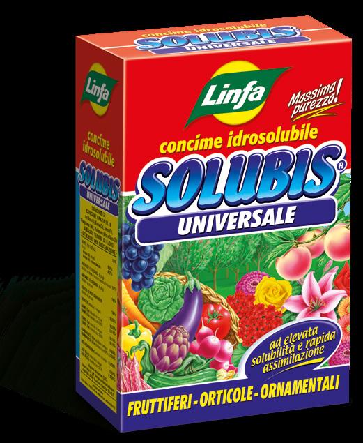 Caratteristiche - I motivi che inducono a limitare le concimazioni minerali di fondo sono ben noti: rischi di salinità eccessive e perdite di sostanze nutritive per dilavamento. È quindi buona norma utilizzare i concimi minerali soprattutto nella fase di mantenimento, con regolari apporti nutritivi a piccole dosi, commisurati alle effettive capacità di assorbimento delle colture nelle varie fasi della loro attività vegetativa e produttiva. Per la loro elevatissima purezza e solubilità, i concimi idrosolubili Solubis soddisfano al meglio questa importante pratica agronomica: veicolate dall’acqua, le sostanze nutritive sono infatti prontamente utilizzate dalle piante, sia per via radicale (metodo principale di somministrazione) che fogliare.