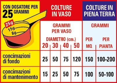 o in buchette profonde 20/30 cm. (due o tre per mq.). Stessa dose nella concimazione d’impianto, distribuendo il prodotto nella buca di piantagione ed interrandolo leggermente per evitare il contatto diretto con le radici; Floreali in piena terra - all’impianto, alla dose di 20-40 grammi per mq.; stessa dose durante la fase vegetativa, ogni 30-40 giorni; Ornamentali e floreali in vaso - prima dell’invasatura alla dose di 50-100 grammi ogni 100 litri di terriccio (le dosi più basse sono consigliate per le piante giovani o per le piante acidofile); durante la fase vegetativa, ogni 30-40 giorni, alla dose di 15-80 grammi per pianta (il dosaggio più basso si riferisce a vasi del diametro di 20 cm., quello più alto a vasi di 50 cm.);