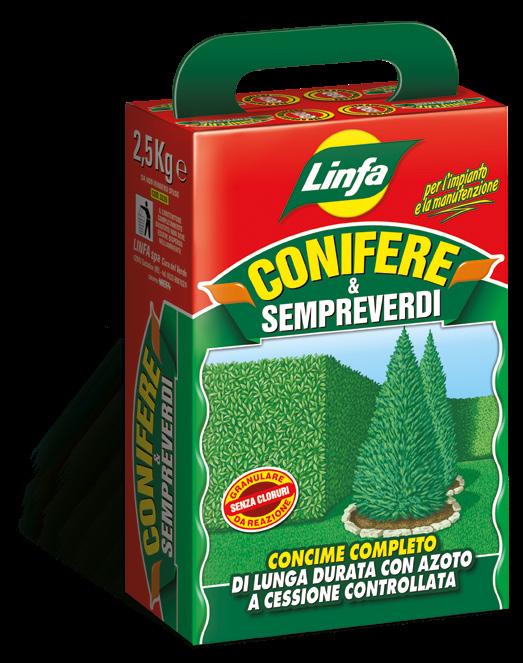 Caratteristiche - Concime completo studiato espressamente per favorire il più armonico sviluppo strutturale, sia aereo che radicale, di tutte le conifere (abeti, pini, thuje, larici, cipressi, ginepri, tassi, cedri) e le siepi sempreverdi (lauroceraso, bosso, ligustro, agrifoglio, olivastro, pittosporo, photinia, pyracantha, evonimo, oleandro).