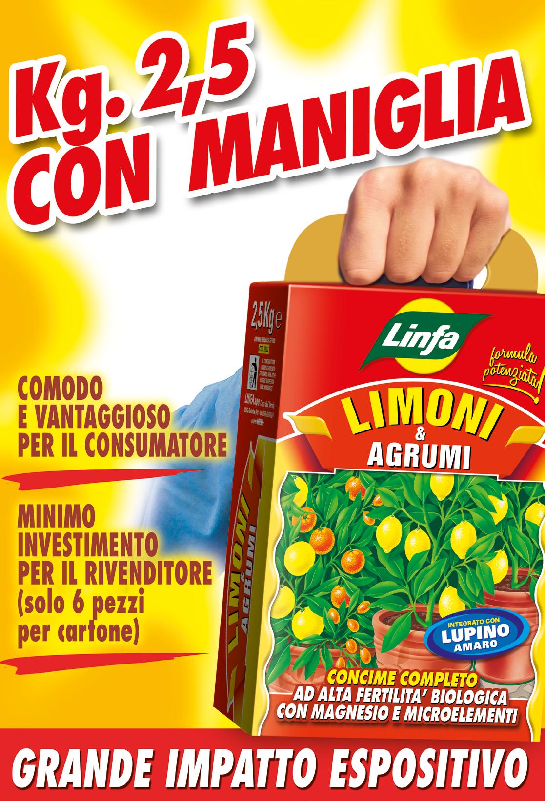 Il concime Limoni & Agrumi, nei due formati da 1-2,5 Kg, può essere consegnato anche in minibox espositore, di modesto ingombro (cm 40x60), facile movimentazione e grande impatto cromatico e comunicativo. Studiato con una precisa finalità di servizio (gestione razionale del magazzino; facile controllo delle rimanenze), il minibox espositore rappresenta soprattutto una grande occasione di comunicazione all’interno del punto vendita. L’esperienza ha infatti ampiamente dimostrato che l’esposizione ordinata non soltanto “valorizza il prodotto” ma aumenta sensibilmente le occasioni di vendita, a tutto vantaggio delle rotazioni e dei sell-out.
