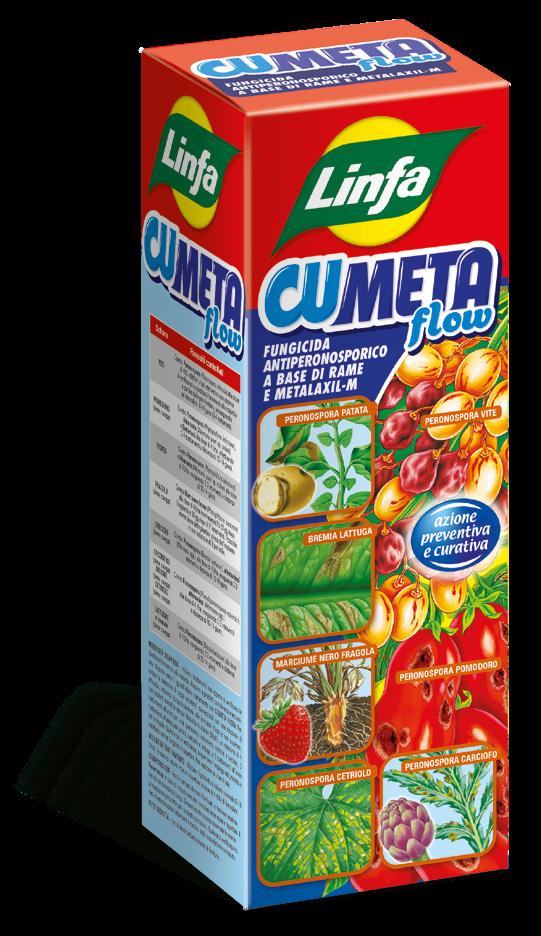 Caratteristiche - Cumeta Flow è la più moderna espressione degli antiperonosporici sistemici, efficace contro tutte le differenti specie di peronospora che infettano la vite e le numerose colture orticole. Il Metalaxil-M si caratterizza per la spiccata sistemia e l’elevata attività biologica, curativa e preventiva, nei confronti dei patogeni bersaglio, garantendo una pronta e prolungata protezione della vegetazione presente al momento del trattamento e di quella in via di formazione. La frazione rameica, sotto forma di solfato tribasico, sinergizza l’azione della componente sistemica garantendo anche una protezione per contatto, l’ottima copertura della vegetazione, la buona resistenza al dilavamento, oltre ad assicurare un’eccellente protezione nei confronti delle batteriosi. Cumeta Flow è il fungicida ideale per la difesa delle colture nelle fasi iniziali dello sviluppo quando, per il rapido accrescimento, è fondamentale garantire una protezione prolungata e costante anche della vegetazione di nuova formazione.