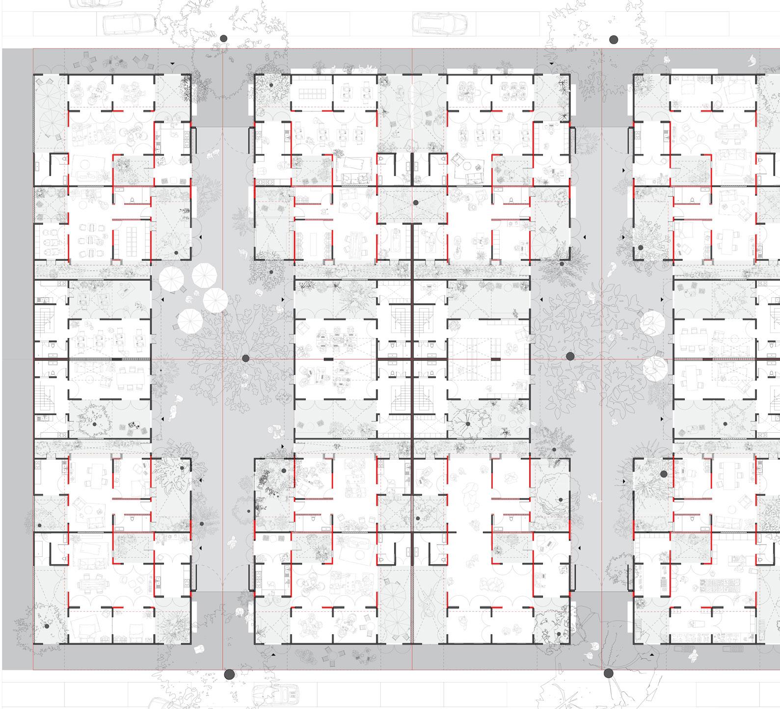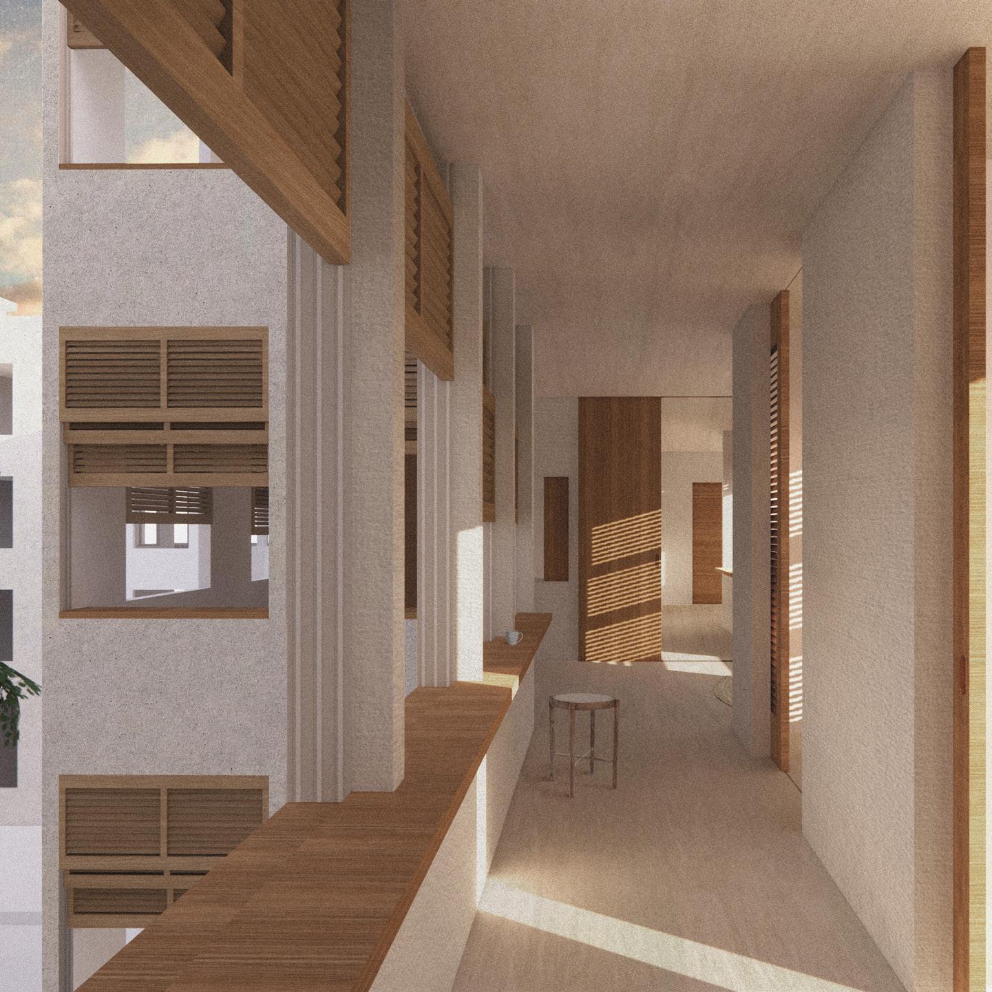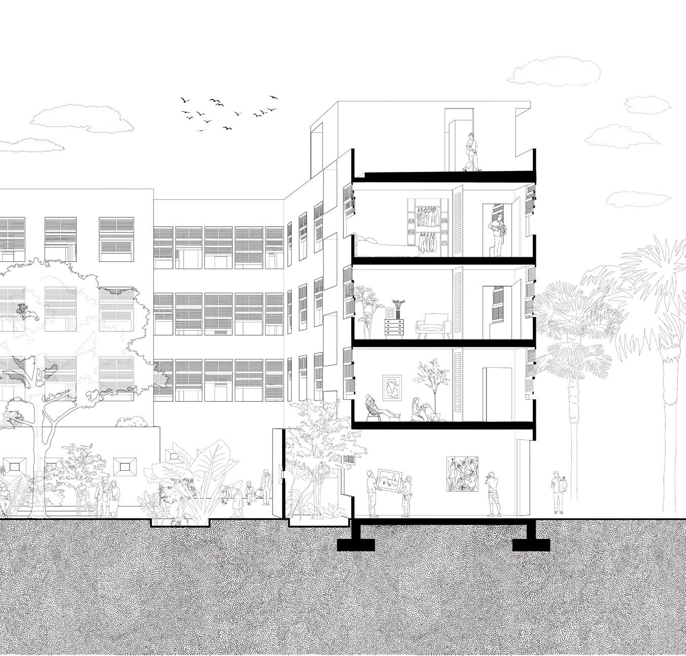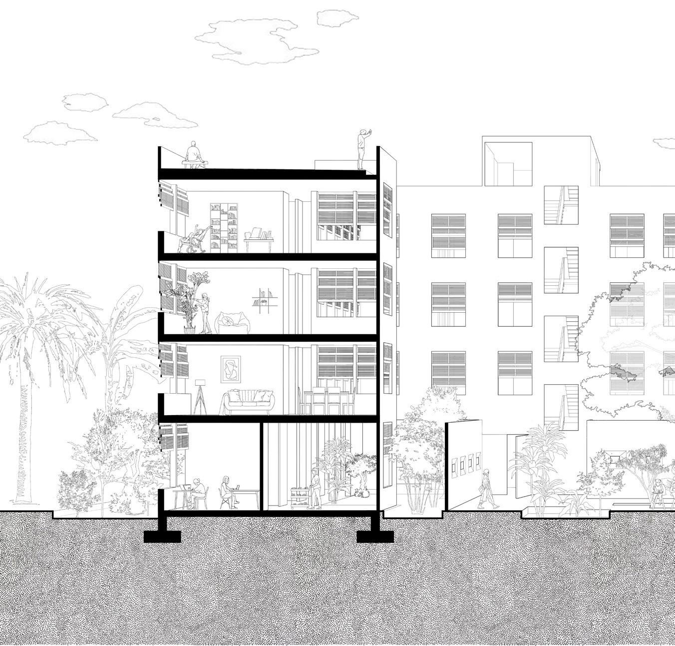 This project originated with an analysis of thresholds in Barcelona, focusing on their role as the division between private and communal spaces in residential architecture. A parallel study examined the climatic conditions in Puerto Rico, shaping the final design located on the island. The project adopts tropical passive design principles, with housing units connected end-to-end in a enclosed configuration that enhances natural ventilation through a central courtyard. This enclosed garden space provides a serene retreat within the urban environment. The arrangement of the units also addresses challenges related to spatial adjacency, offering flexibility and adaptability for various living arrangements.