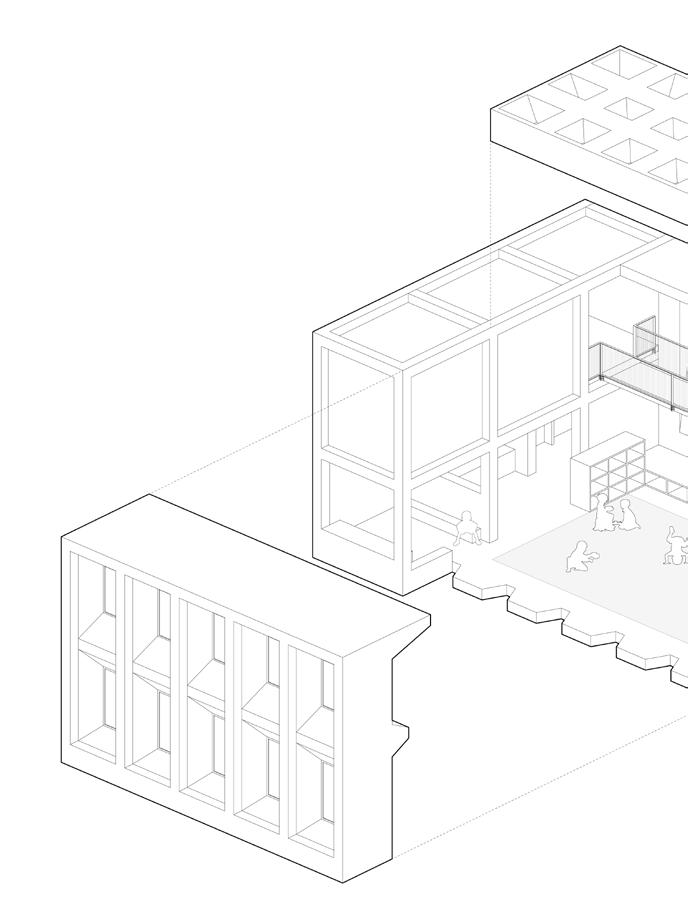 The school’s design starts with the classroom, following a child-centered approach where teachers act as observers, helpers, and environment preparers. The design features distinct two-story classrooms. The school consists of six classrooms, arranged in two stacked groups, with a 10-foot height difference between the entrances of adjacent classrooms. All classrooms are connected to a central atrium.