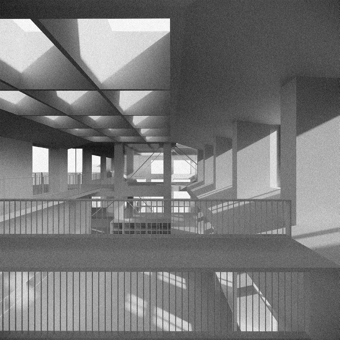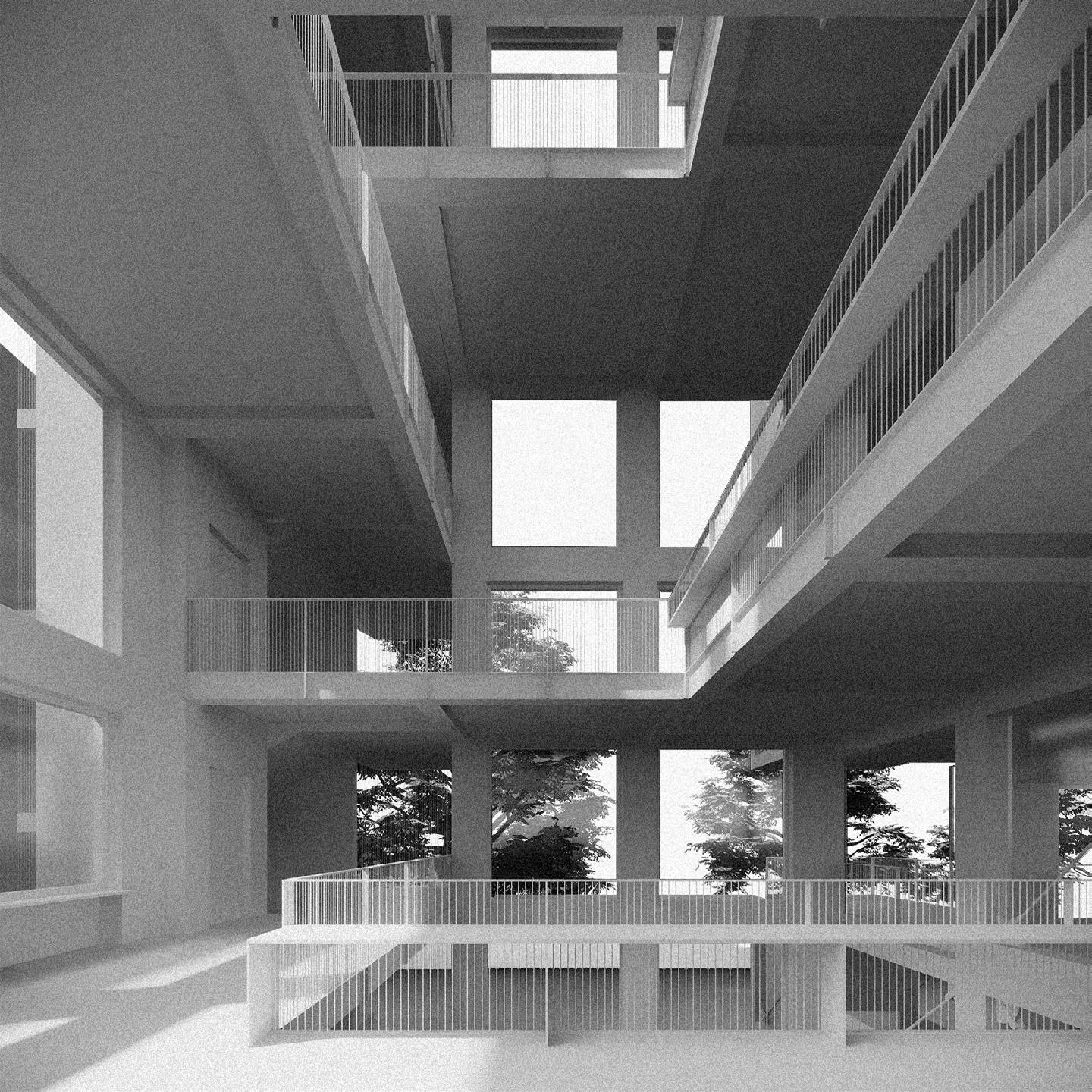 - The entrances to the upper classrooms are positioned along the edges of the lower greenhouses, creating independent cantilevered structures. Visually connecting communal spaces between classrooms of different grade levels.