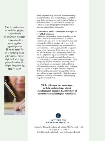 narer, opgaveretning, enetimer, deleksamener og konstant kontakt med skolens faglige leder Marianne Palm, der sammen med et team af faglærere underviser enten i Ry i Jylland eller i Dragør på Sjælland, og du får også ganske meget undervisning, du kan modtage hjemmefra. Vi underviser både i samme rum, men også via et væld af webinarer – Vi brugte webinarer og zoommøder lang tid før, covid-19 lærte de fleste mennesker at anvende onlinemøder, og derfor var det let at fortsætte med at bruge det effektive redskab, når vi over to år skulle være sammen hver for sig, fortæller Dinna, som fortsætter, – det har gjort, at vi fik optaget en masse undervisning, og derigennem har vi kunnet udvide pensum med rigtig mange værdifulde timer. Det gør os i dag til landets største uddannelse indenfor komplementær behandling, men vi kan stadig ikke undvære at være sammen i rigtig mange fag. Biopati, naturopati, ernæring, læren om urter, læren om mennesker skal også foregå i fællesskab i samme rum, og derfor åbner vi dørene op på vid gab for at tilbyde mere end nogensinde en modulbaseret undervisning, slutter Dinna, som ud over at være daglig leder på skolen også er uddannet psykolog, zoneterapeut og selvfølgelig biopat/naturopath ibm.