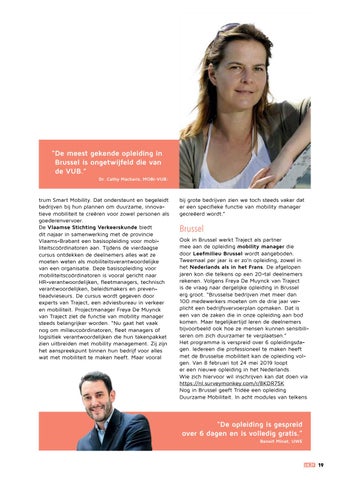 trum Smart Mobility. Dat ondersteunt en begeleidt bedrijven bij hun plannen om duurzame, innovatieve mobiliteit te creëren voor zowel personen als goederenvervoer. De Vlaamse Stichting Verkeerskunde biedt dit najaar in samenwerking met de provincie Vlaams-Brabant een basisopleiding voor mobiliteitscoördinatoren aan. Tijdens de vierdaagse cursus ontdekken de deelnemers alles wat ze moeten weten als mobiliteitsverantwoordelijke van een organisatie. Deze basisopleiding voor mobiliteitscoördinatoren is vooral gericht naar HR-verantwoordelijken, fleetmanagers, technisch verantwoordelijken, beleidsmakers en preventieadvieseurs. De cursus wordt gegeven door experts van Traject, een adviesbureau in verkeer en mobiliteit. Projectmanager Freya De Muynck van Traject ziet de functie van mobility manager steeds belangrijker worden. “Nu gaat het vaak nog om milieucoördinatoren, fleet managers of logisitiek verantwoordelijken die hun takenpakket zien uitbreiden met mobility management. Zij zijn het aanspreekpunt binnen hun bedrijf voor alles wat met mobiliteit te maken heeft. Maar vooral